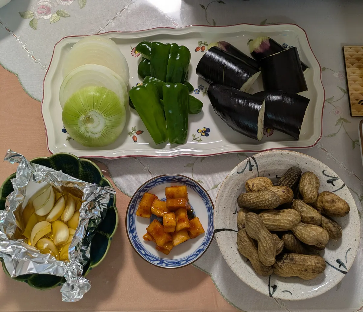 牛の肩ロース肉、豚トロ、ミノ、玉ねぎ、ピーマン、茄子、にんにくの焼肉と、カクテキ、茹でジャンボ落花生美味しそうですね😋
