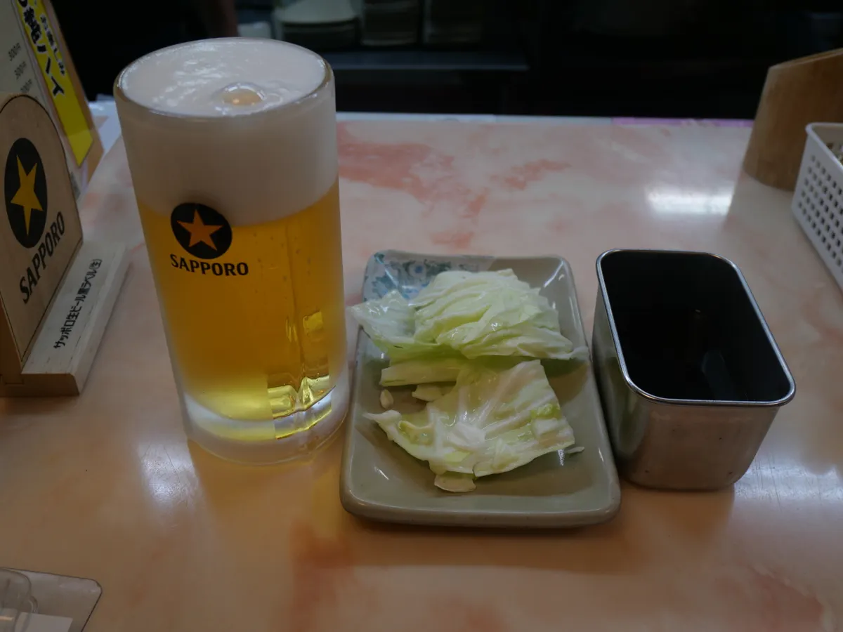 串揚げが来るまでは黒ラベル🍺とキャベツで😋