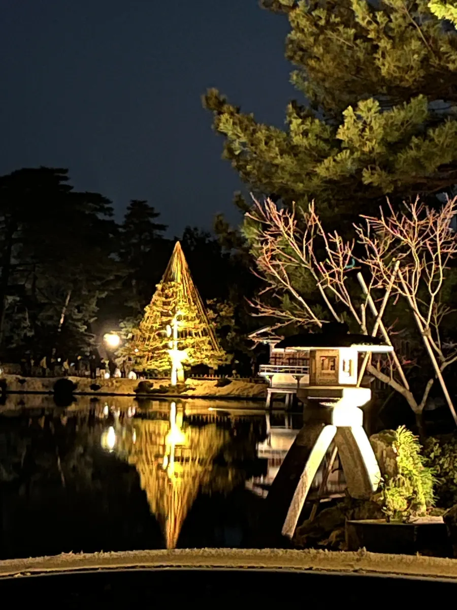 この水面の鏡に映った美しい夜景は雪が無いからこそですよ🥰