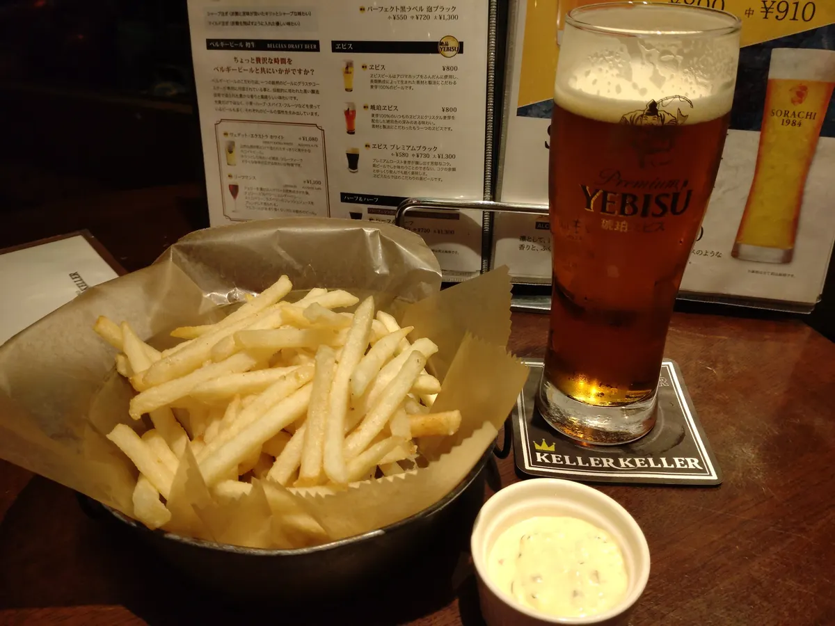 琥珀ヱビスおかわりして フライドポテト 自家製タルタルソース