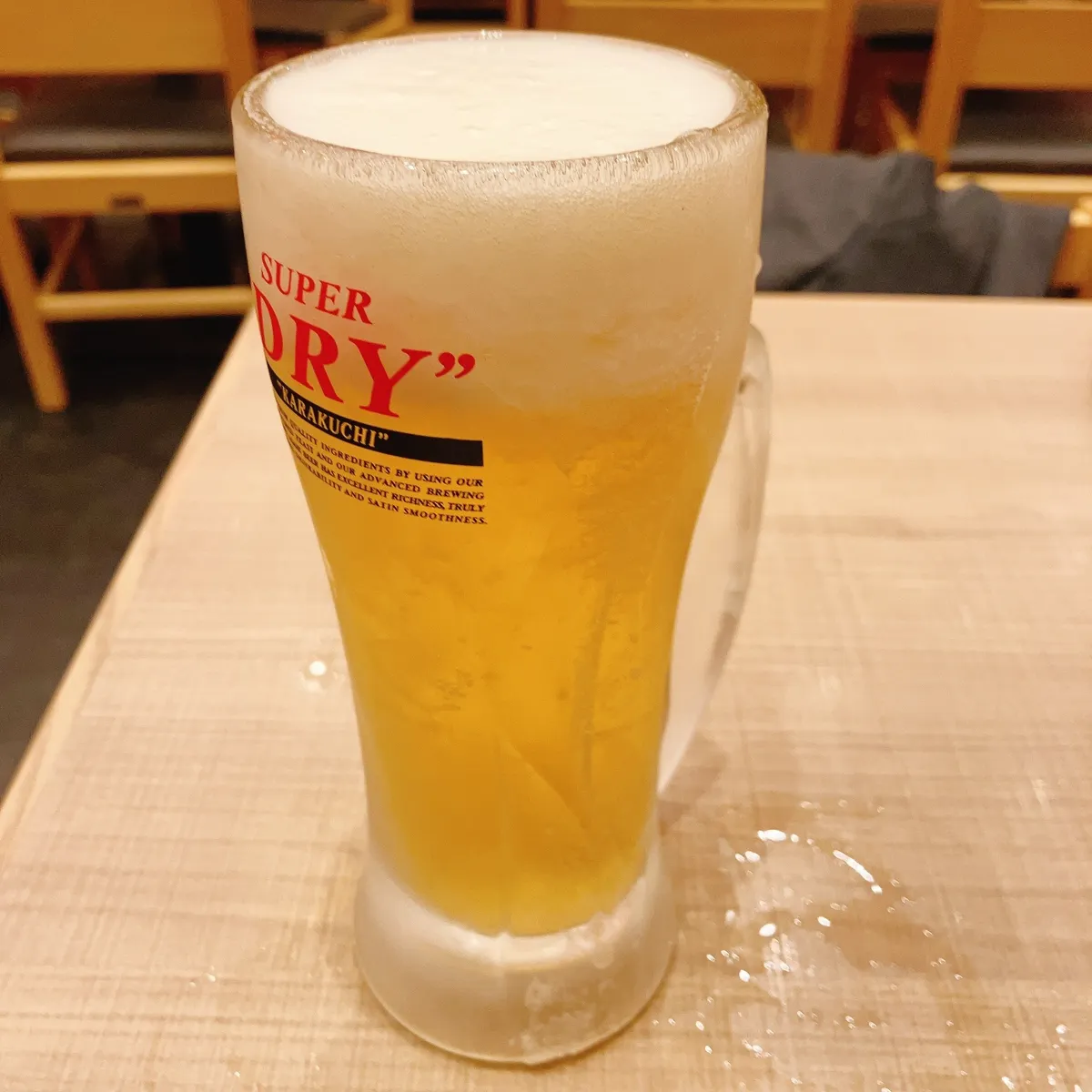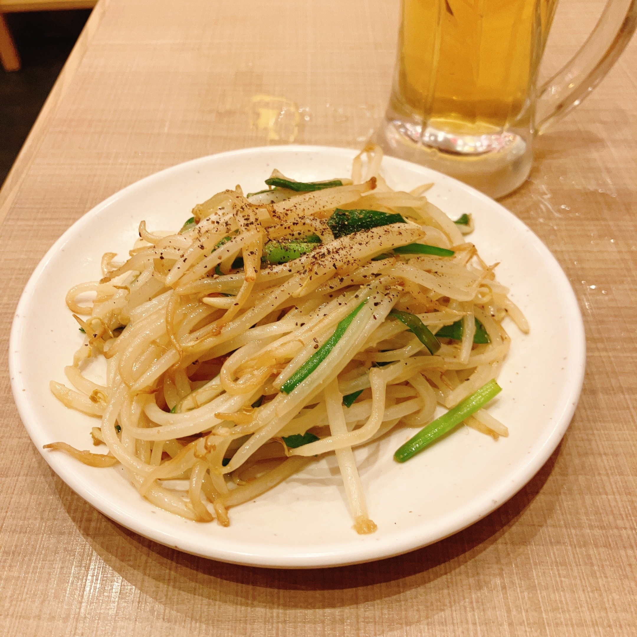 のどごし一筋のアサヒスーパードライのアテはもやし炒め。これがなかなかの物量ですが、めっちゃ美味いのです。