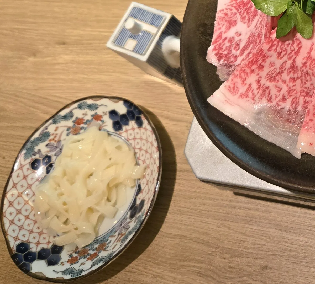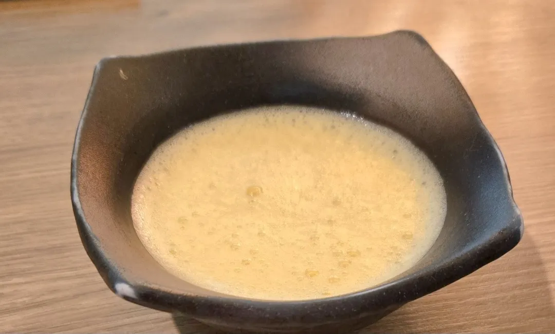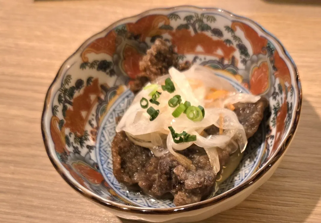 ソラチをゴチになったので、若干売り上げに貢献しようと、本日のおすすめメニューの中のイチ押し、黒毛和牛の焼きしゃぶ🐮焼きしゃぶした物が提供されると思いきや、卓上コンロで仕上げるタイプで、スタッフさんが丁寧に説明してくれました😊肉の下に葱があって、葱を肉で巻いて、軽くホイップされた卵につけて食べます。〆は稲庭うどん的なうどん、軽く焼き卵につけて食べます😊美味しゅうございました😊