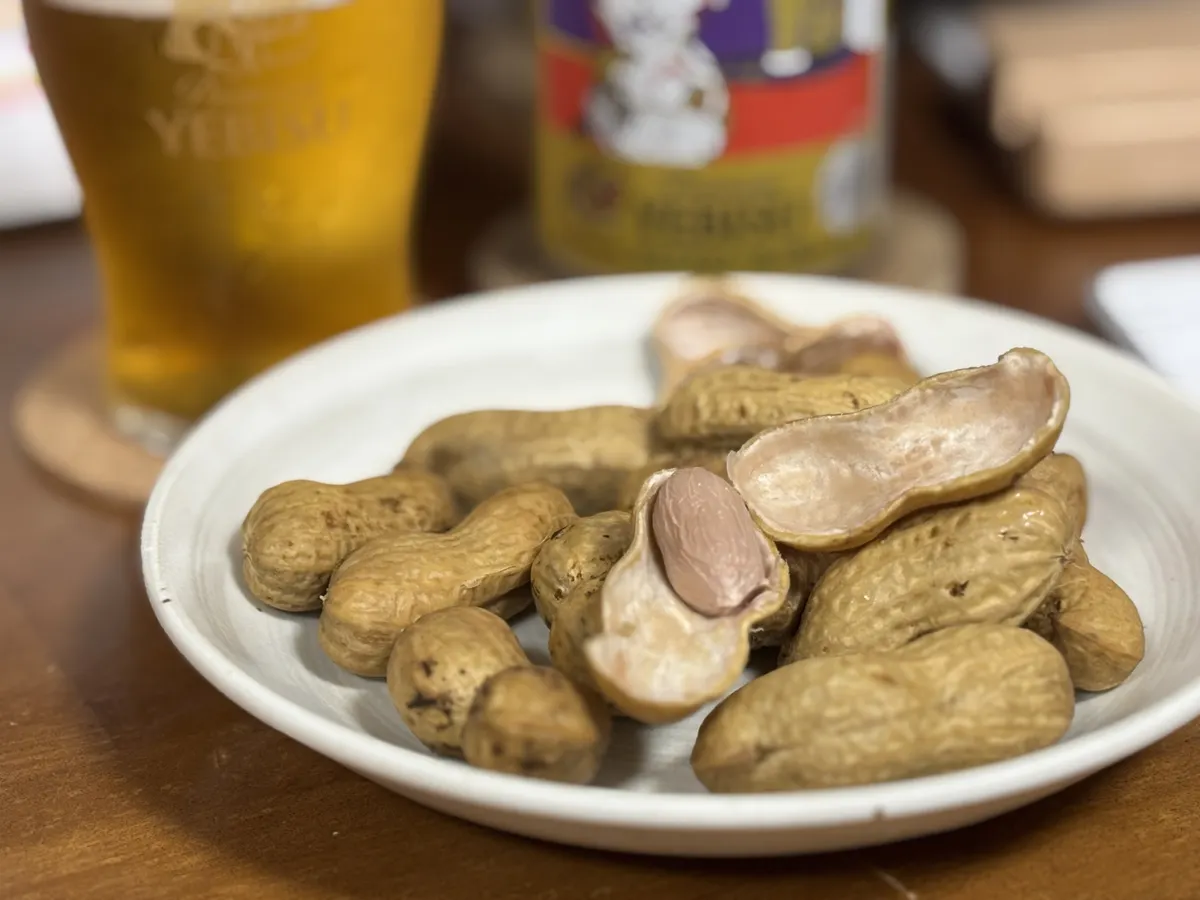 つまみの落花生は圧力鍋で茹でた(蒸した?)おおまさり。