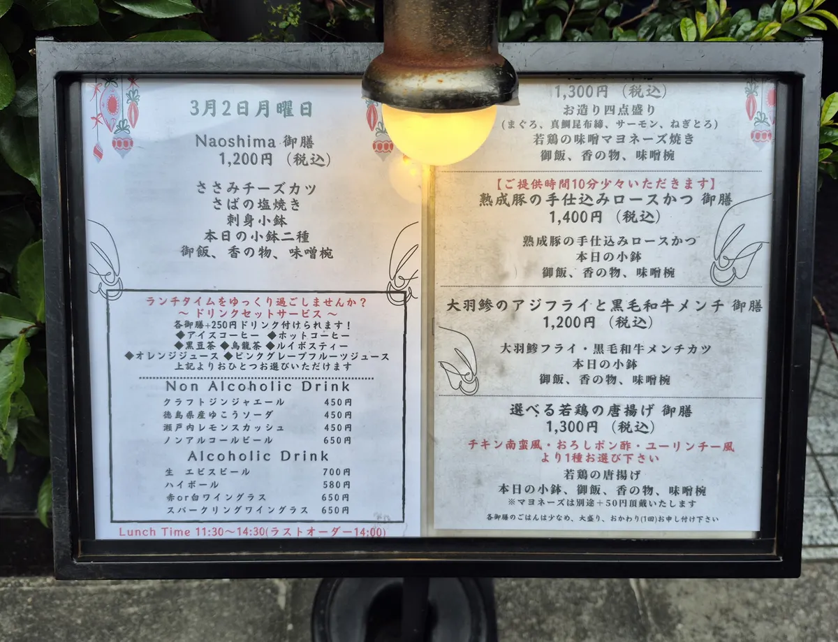 ↑↑五反田駅近くにある,瀬戸内和菜(和食)のお店。日替わりのNaoshim御膳を選択。リーズナブルに和食が楽しめます。ヱビス生ビールは,700円(ランチ価格)です。ちなみにグラスは無地ですけど“ヱビス生ビール”です。↓↓