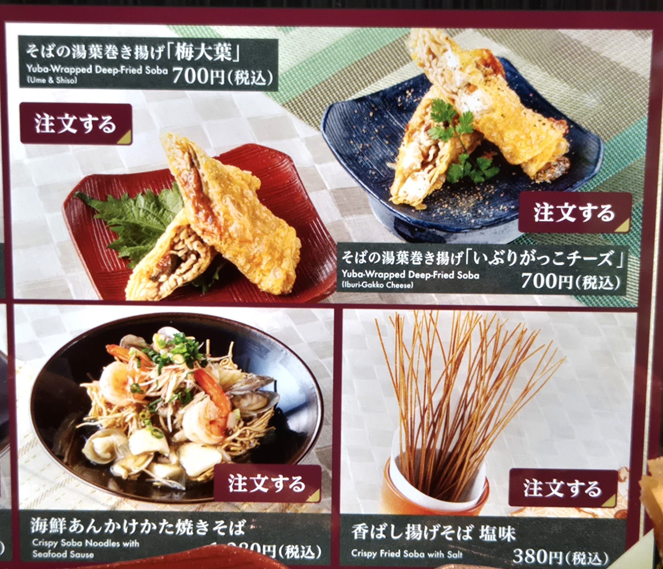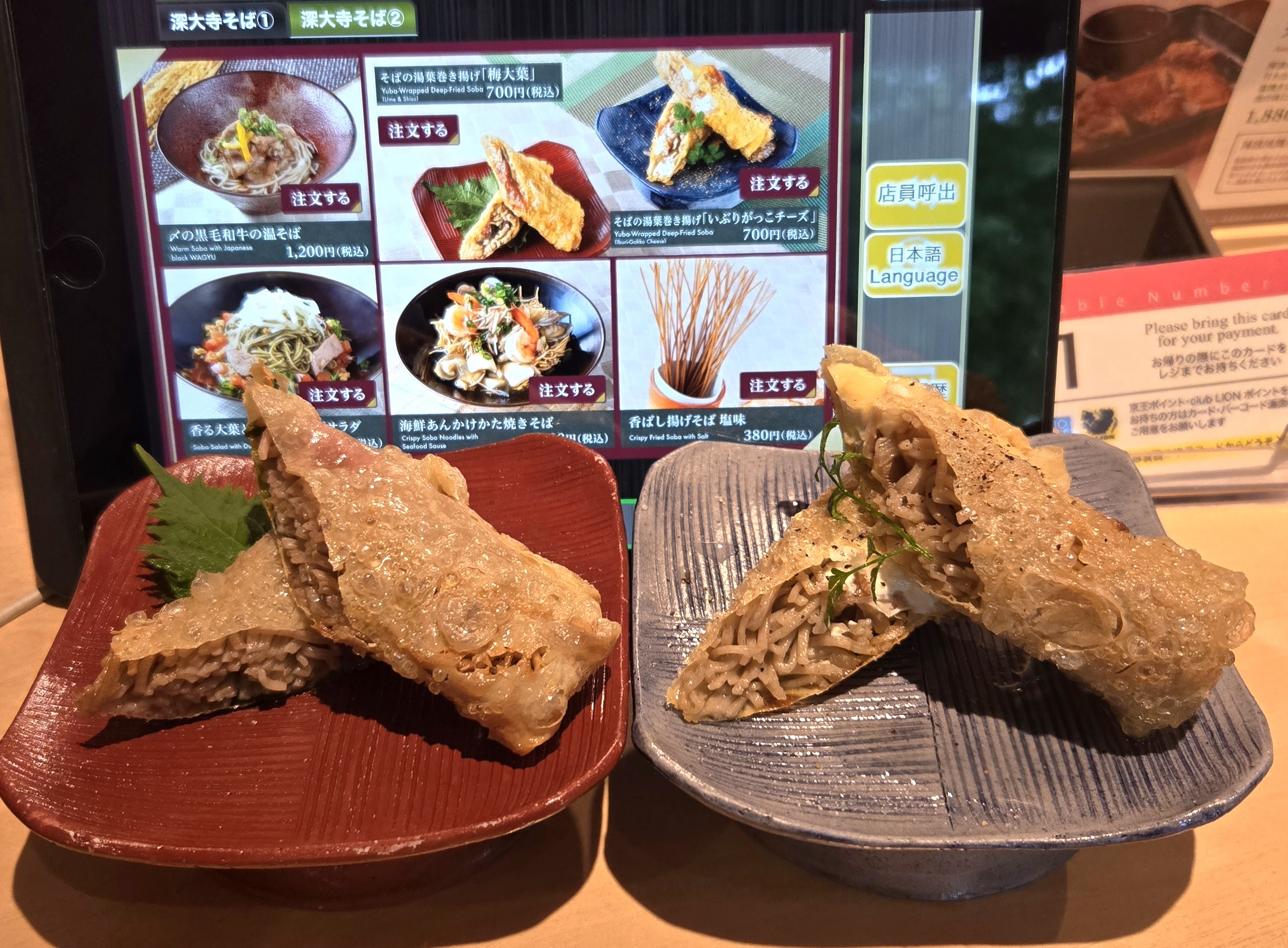 そばの湯葉巻き揚げ「梅大葉」と「いぷりがっこチーズ」食べ比べしました😅