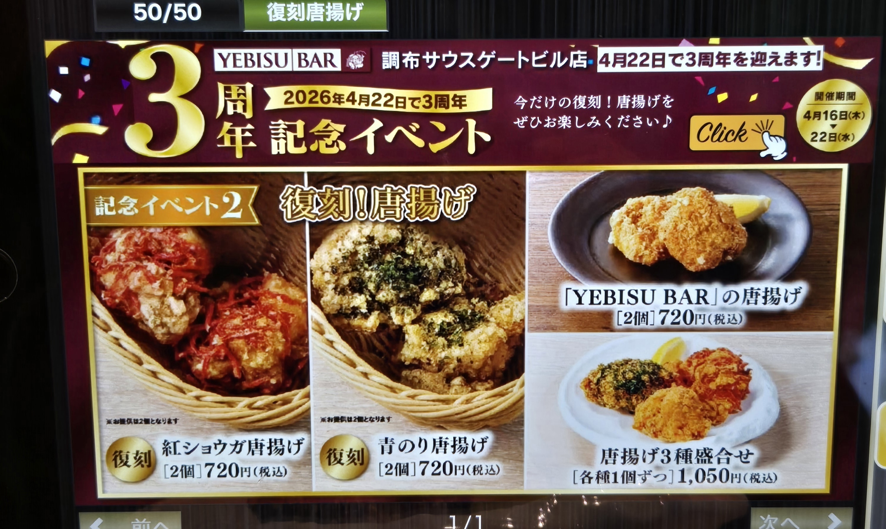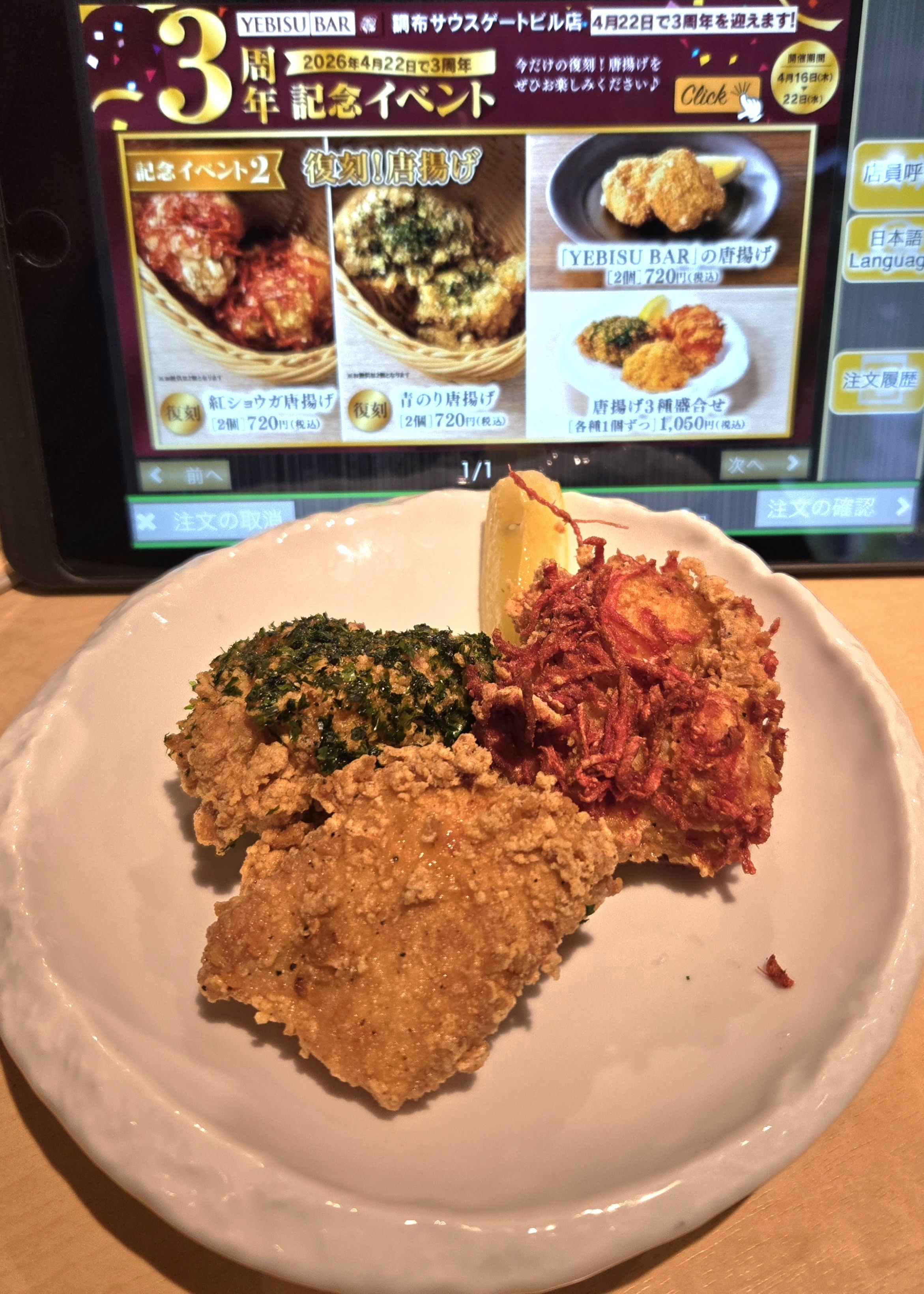 予約して行きました😊予約して正解でした。目玉的なイベントメニューはないものの、ほぼ満席状態でした😊滅多に行かなくなっので、調布店限定メニューを3品、イベントメニューの唐揚げ3点盛りを注文🐔
