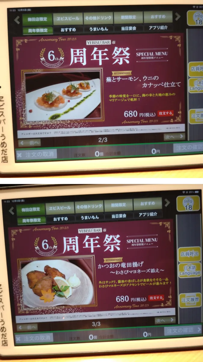 今年は周年祭メニュー3種類ありました、紙ベースのメニュー表がまだ置いてなかったので