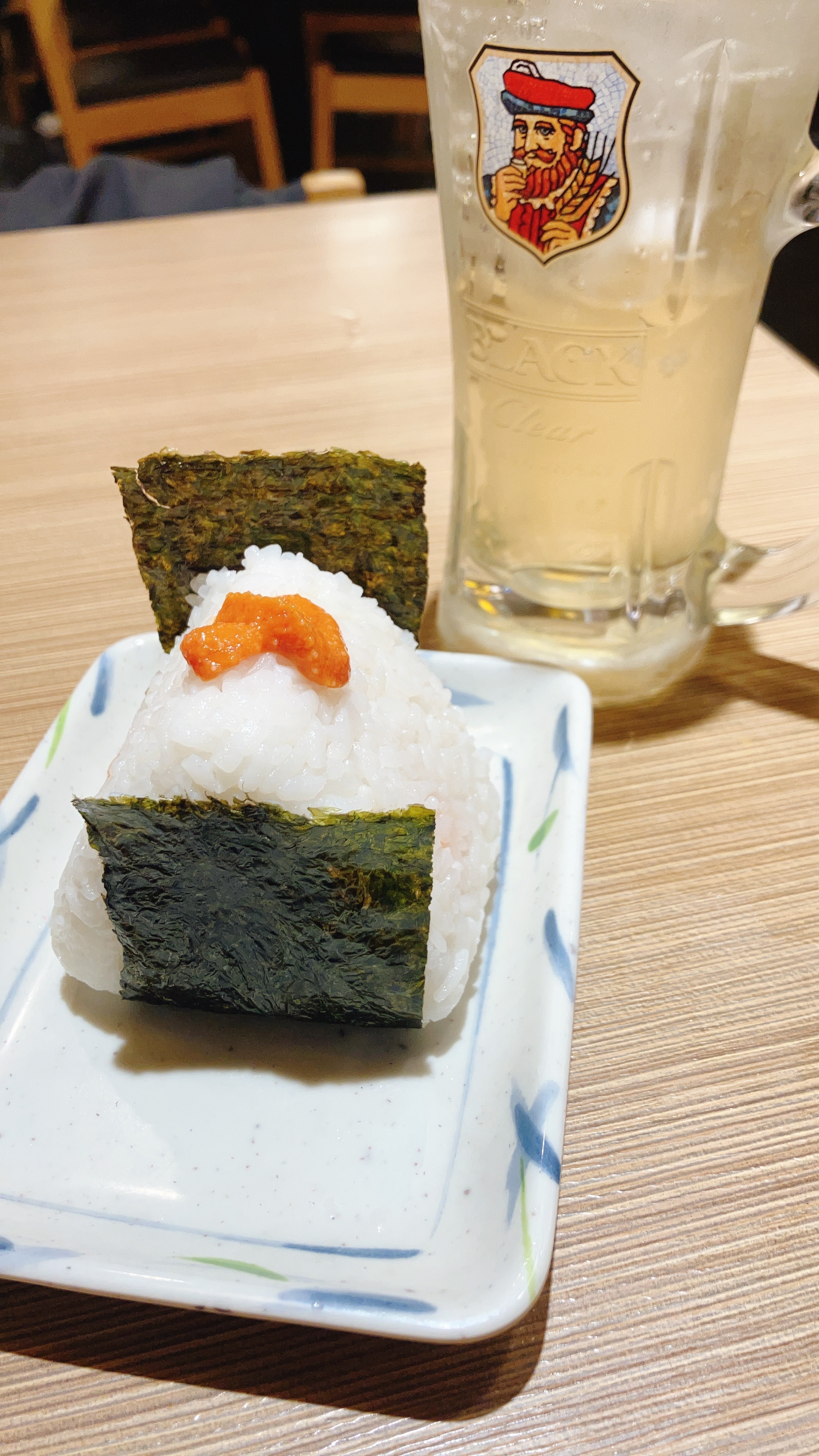 4軒で12杯飲んでラーメン屋さんでラーメン食べて撤収と思いきや当店を予約し、追加で10杯頂き本日22杯となりました。あかんやつや。アテは大好物の明太おにぎり。さっきラーメン食べたのにな。笑