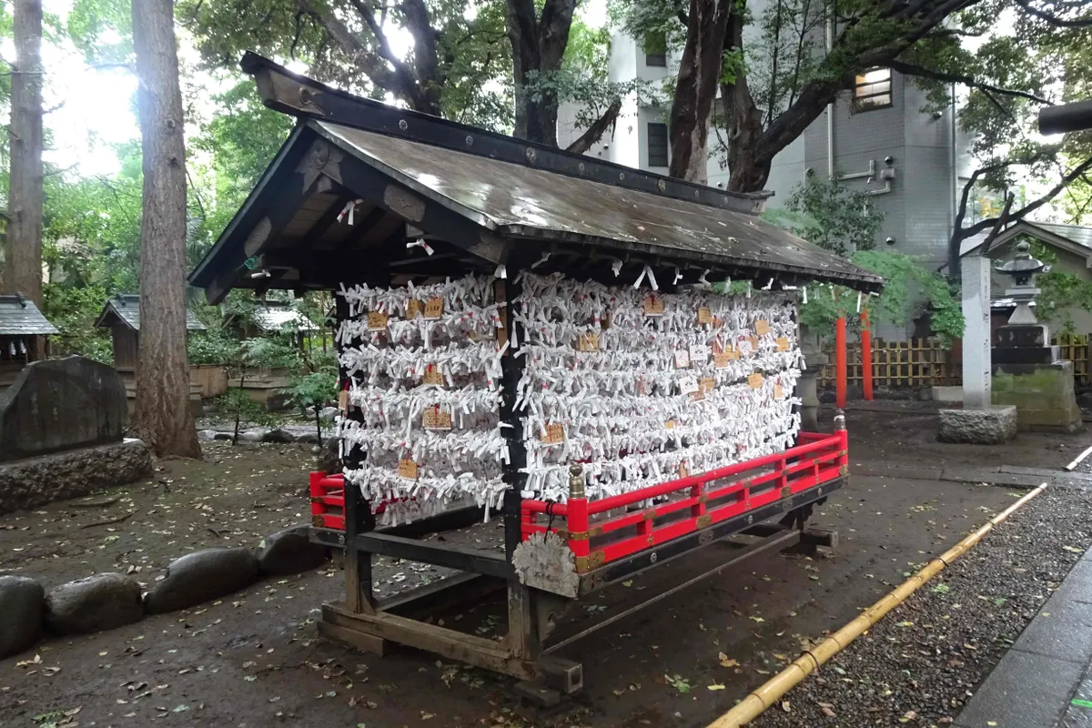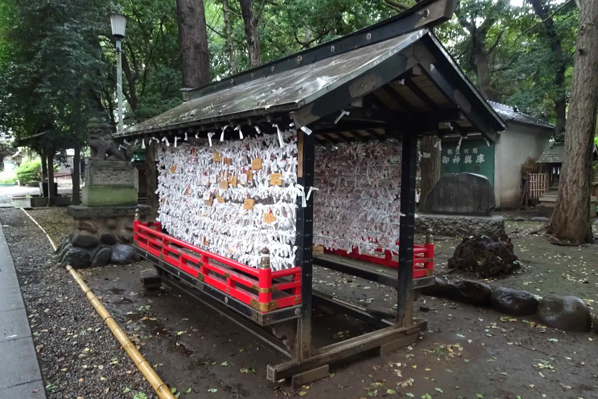そして参道に戻ると、おみくじ結び所があったのですが、コの字型の作りでした。
