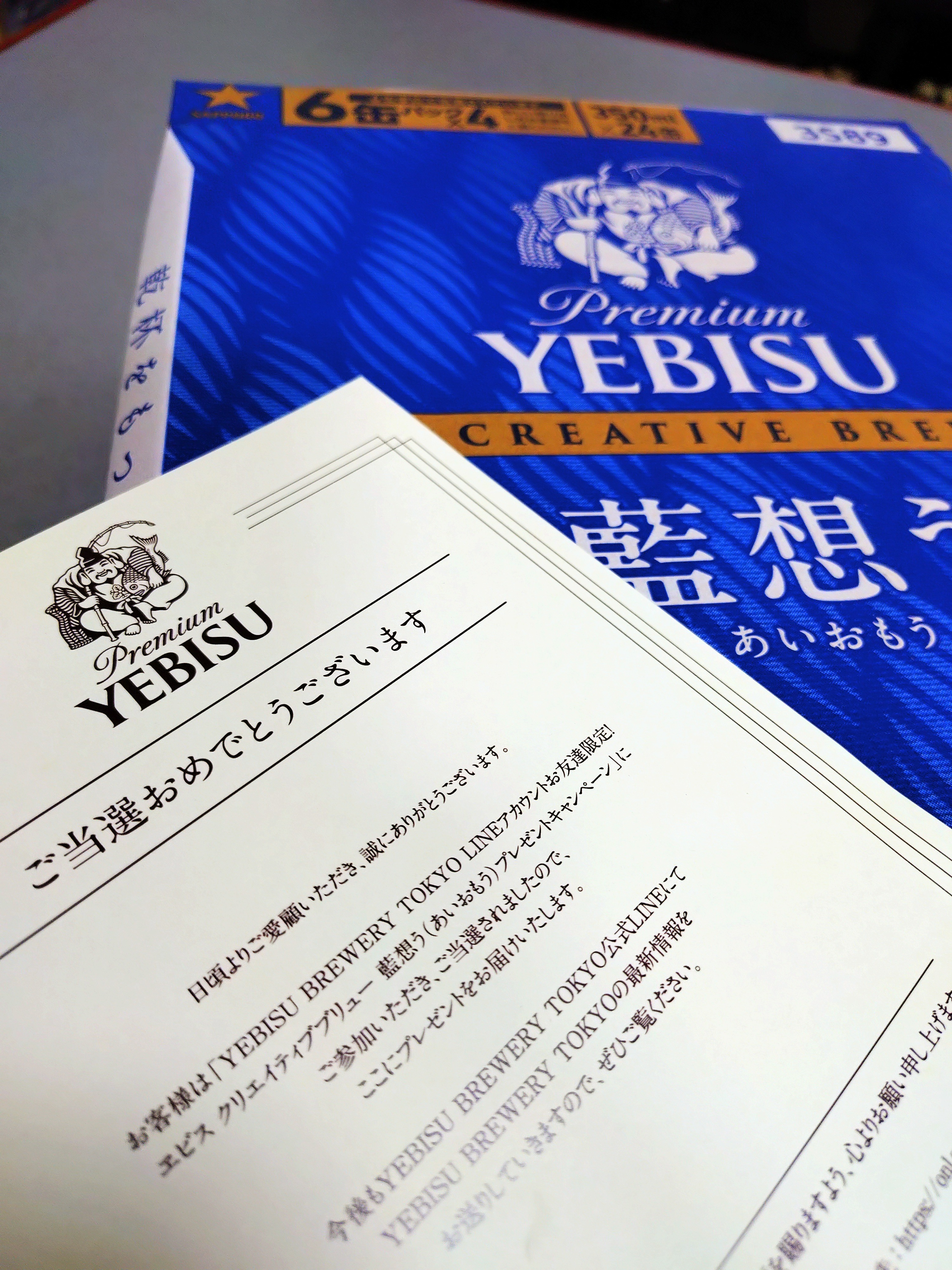 「YEBISU BREWERY TOKYO LINEアカウントお友達限定」の藍想うプレゼントキャンペーンに当選したとの事です。
