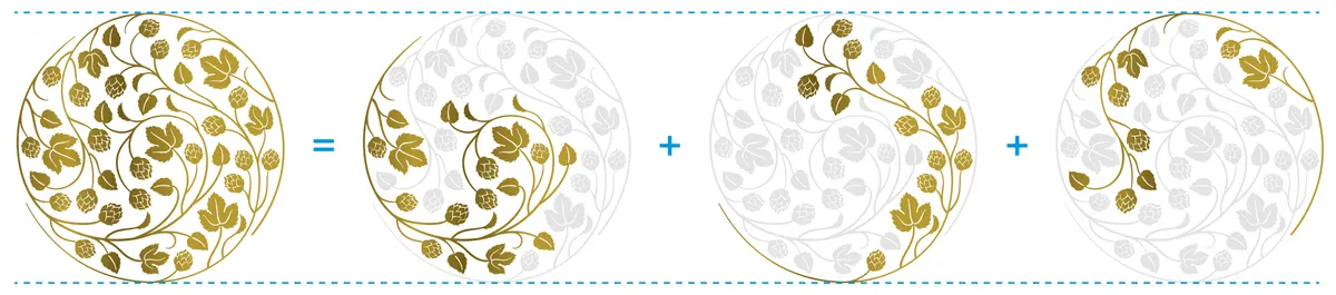 紋形状の柄を左右非対称に配置している「揃い過ぎていない感」が日本らしさを強めると同時に、動きを感じさせ、「融合」の比喩にもなっています。またこの配置がPKGとしての収まりを良くもしていると思います。1つの紋は形状の違う3本のホップの蔓(つる)で構成されていて、ここでも「3種のホップの融合」を表現しています。