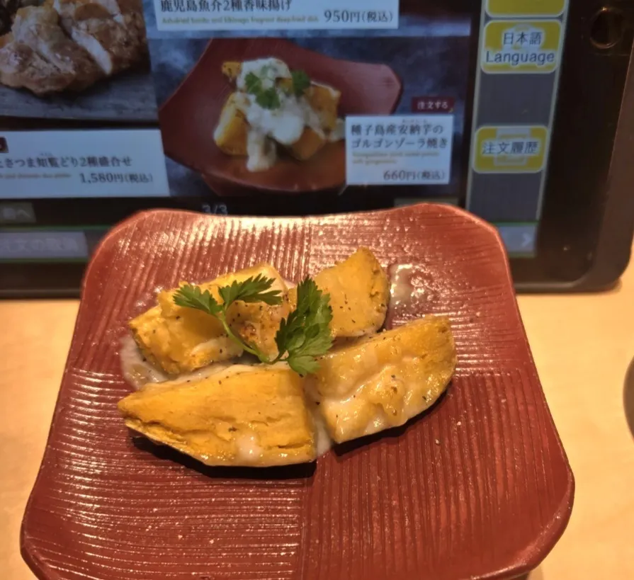 2品目、種子島産安納芋のゴルゴンゾーラ焼き。