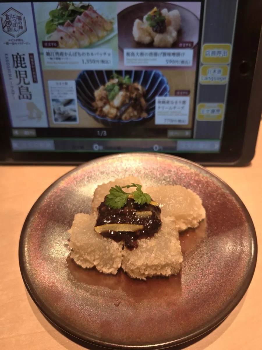 桜島大根の唐揚げ黒豚味噌掛け。