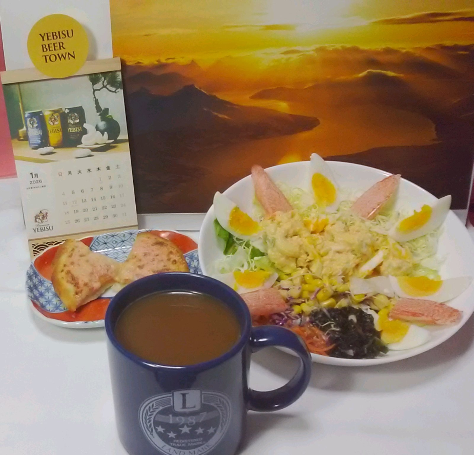 トップ > ヱビスフォト > 新年最初の朝食は? 恵比寿大黒 2026/01/02 00:31 新年最初の朝食は? 新年最初の朝食は、いつものマカロニサラダ・・・では無く「玉子とツナのポテ・マカ・サラダ」からです。しかし、何でも混ぜ込めば良いと言う物でも無い?取り敢えず初日の出のパネルをバックに、頂きまぁ~す。勿論、能登の応援カニカマも添えて。 いいね 共有する 共有する X facebook LINE リンクをコピー コメントする 0 件の返信 (新着順)
