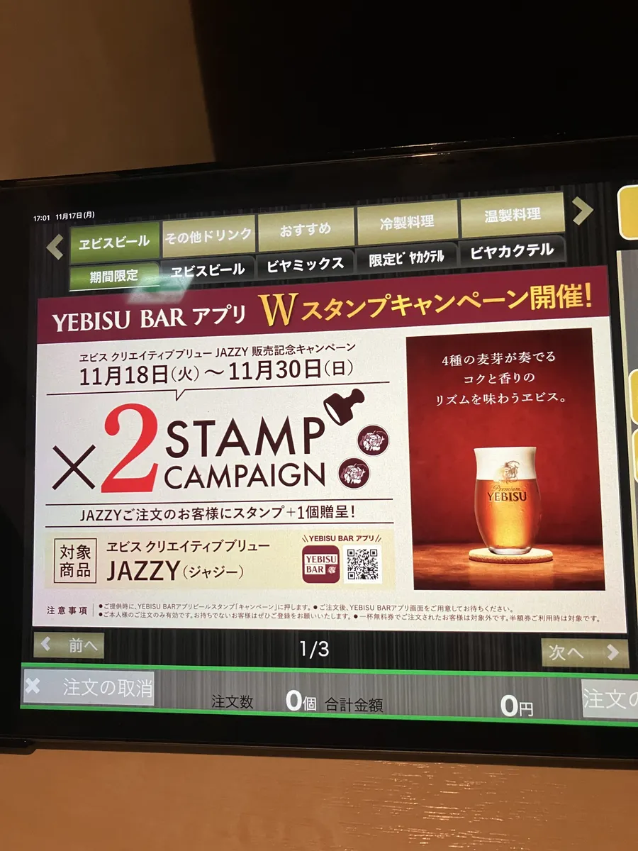 このJAZZYのWスタンプキャンペーン(11/18-30)で無料券は対象外ですが、半額券は対象とのことで、秋の琥珀ビールフェアで溜まりに溜まった未使用マイルを使用した11枚半額券が猛威を振るうでしょう。巧妙な営業戦略ですね。私はまんまと術中にハマっております。先ずは秋の琥珀フェアで獲得した半額券を投入しました。魔性のJAZZYバブル🫧到来です。笑