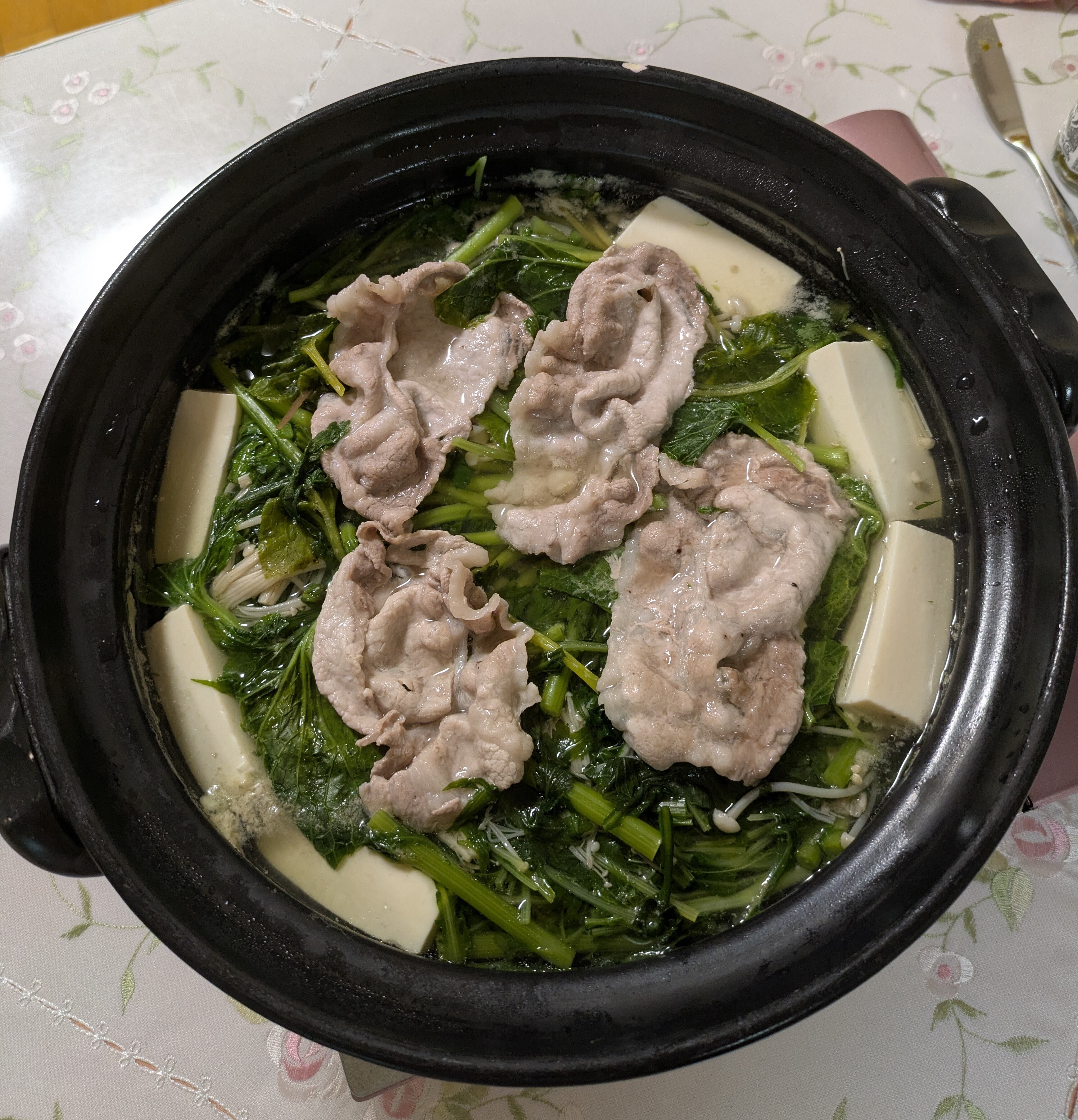 水菜、春菊、わさび葉、えのき、豆腐、豚肩ロースとロース肉のお鍋と一緒にEXTRA Feelを楽しみました