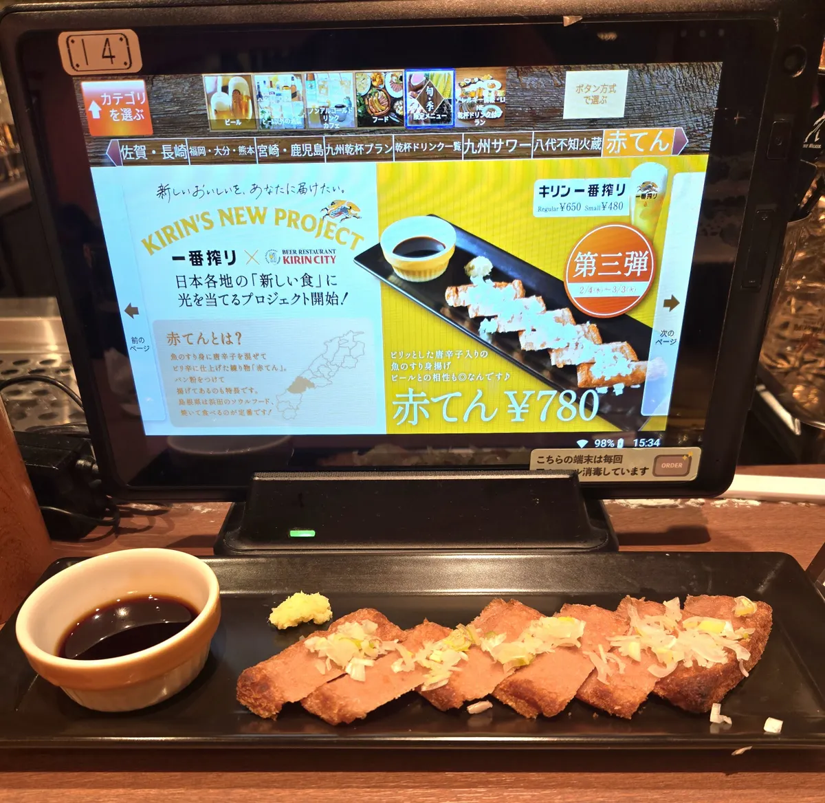 食べたかった九州フェアメニューが最終日ということで、SOLD OUT(>_<)一番搾りのマリアージュメニューはまだあったので、そちらと一番搾りを注文🍺赤てん、島根県浜田のソウルフードらしいです。ピリ辛で美味しかったです😊