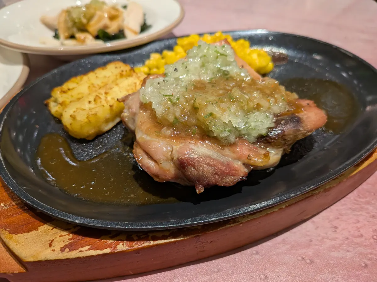 若鶏のディアボラ風、蒸し鶏の香味ソース、ご飯大盛り、これ定番‼️