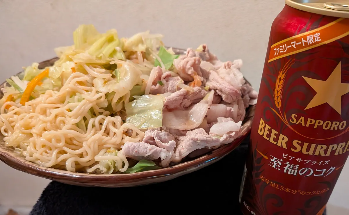 豚肉しゃぶしゃぶ用(200g)とカット野菜(キャベツともやし)2袋分、袋麺は3袋分!🤣