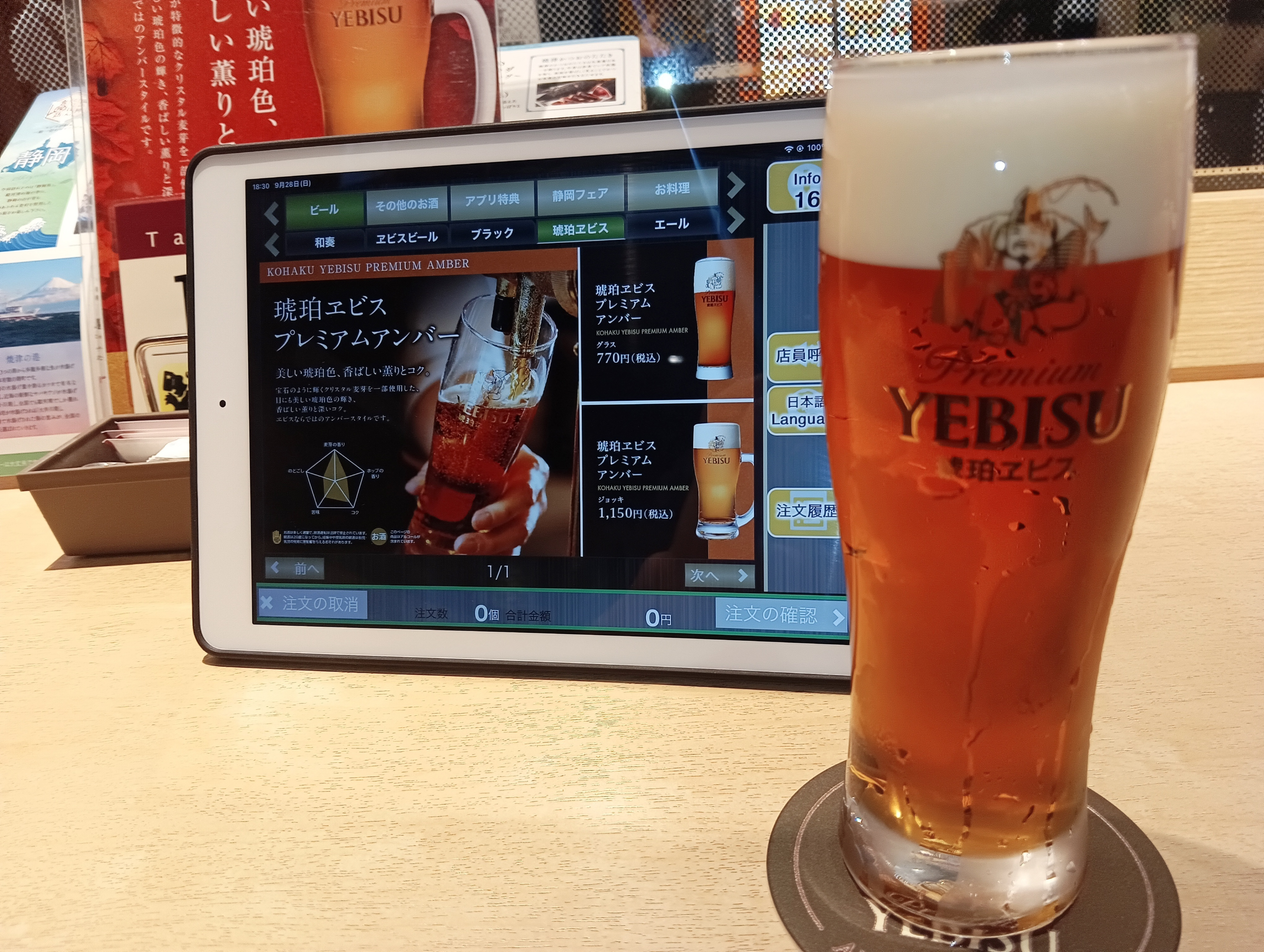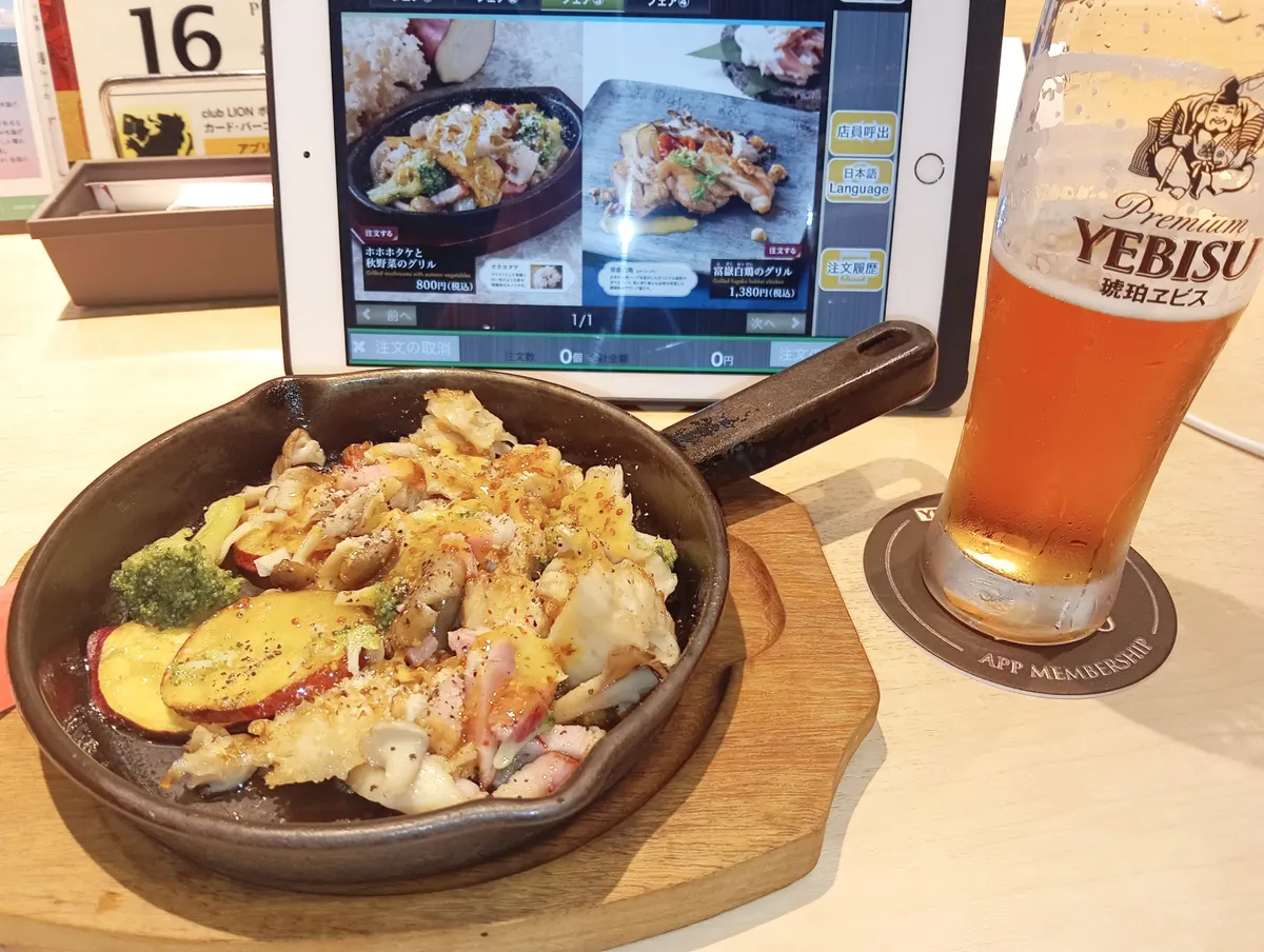 お腹空いてたのでホホホタケと秋野菜のグリルを…!😚なかなか美味いこれ、ビールが進みます!🤭飲み比べセットでプレミアムエールと金エビスをチョイス!