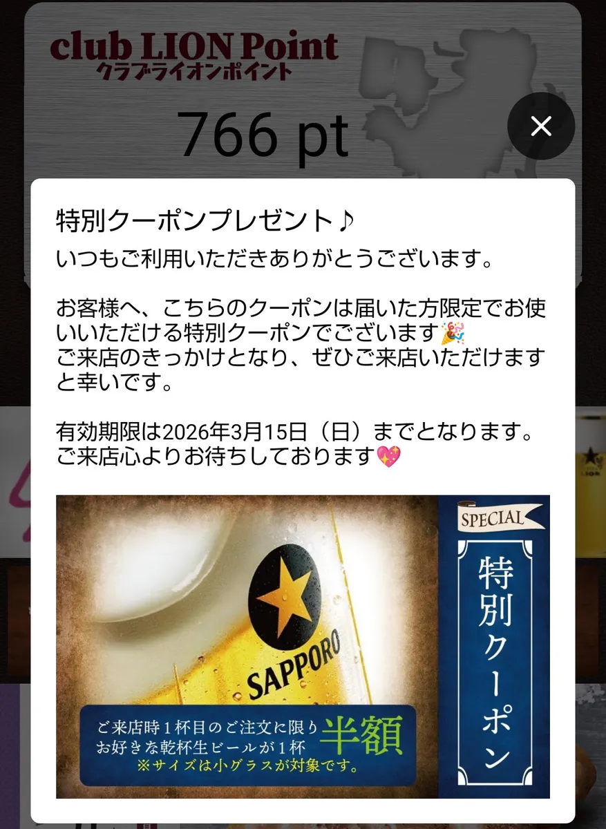 トップ > ヱビスフォト > YEBISU BAR > 特別クーポンで澄深し🍺からスタート monaka 2026/02/23 08:05 特別クーポンで澄深し🍺からスタート 昨日のYEBISU BAR エミオ石神井公園店🚃 ⬇️このclub LION特別クーポンを使って半額で、澄深しからのスタート🍺 その後TOWN住人のM氏が来店、長時間に渡り楽しく歓談させていただきました🍻😊 YEBISUBARエミオ石神井公園店 clubLION特別クーポン 澄深し いいね 共有する 共有する X facebook LINE リンクをコピー コメントする 6 件の返信 (新着順) ミュートしたユーザーの投稿です。 投稿を表示 とらひっぽ 2026/02/23 17:44 monaka さま😲 先のびばーさまと被りますが、YEBISU BAR でも使えるのですね‼️ 知らなかったです🥺 今度、行く機会に使ってみます🙋♀️ いいね 返信する ミュートしたユーザーの投稿です。 投稿を表示 monaka 2026/02/23 17:50 とらひっぽさん 使ったのは石神井公園店ですが、グランスタ八重北店で訊ねた時も「使える」と言われました😊 ただし、最初の一杯のオーダー時ですが😆 いいね 返信する ミュートしたユーザーの投稿です。 投稿を表示 とらひっぽ 2026/02/23 22:43 monaka さま😌 ありがとうございます😊 心得ますッ🫡 いいね 返信する ミュートしたユーザーの投稿です。 投稿を表示 みなとみらい 2026/02/23 12:00 monakaさん M氏です✋🤣 グランスタなら monakaさん居るかなぁ❓🤔 と思いながら入店しますが、monakaさんが石神井店も利用しているとは言え流石に居るとは思いませんで、店長に言われてビックリしましたよ🤭 その後は、まさかの展開でしたが、楽しむことが出来ました🥰 また乾杯しましょう🍻 ヤー❗👍 いいね 返信する ミュートしたユーザーの投稿です。 投稿を表示 monaka 2026/02/23 13:41 みなとみらいさん あのお店でご一緒できようとは、、、予想してませんでした😲 昨日はその後もかなりスペシャルな展開となり、これも予測の範疇外でした😆 また次の機会も楽しく乾杯しましょー❗🫡 いいね 返信する ミュートしたユーザーの投稿です。 投稿を表示 びばー 2026/02/23 09:19 monakaさん エビスバーでつかえるんですね いいね 返信する ミュートしたユーザーの投稿です。 投稿を表示 monaka 2026/02/23 09:22 びばーさん 大丈夫です、使えました🍺😃 いいね 返信する ミュートしたユーザーの投稿です。 投稿を表示 1107 kazu 2026/02/23 09:15 え〜〜‼️ 同じ日に利用しましたか⁉️ 何度か利用使用と思いましたが、最初の一杯目利用のみ…でした‼️ うふふ✨ヤー✨🍻🎶🍀 いいね 返信する ミュートしたユーザーの投稿です。 投稿を表示 monaka 2026/02/23 09:26 最初の一杯、乾杯ビールでしたねー🍻😆 いいね 返信する ミュートしたユーザーの投稿です。 投稿を表示 ループトンネル 2026/02/23 08:34 カラフルですこと。 いいね 返信する ミュートしたユーザーの投稿です。 投稿を表示 たこやきん 2026/02/23 08:25 良かったですね いいね 返信する