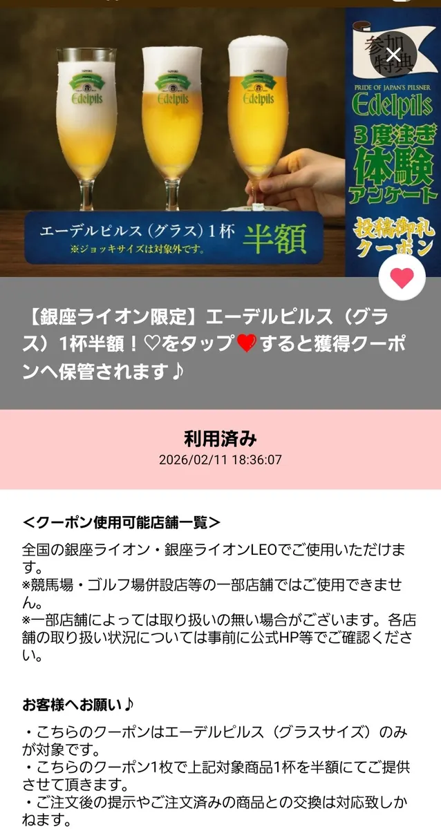 エーデルピルスはCLUBライオンアプリには銀座ライオン、銀座ライオンLEOにて使用可能になっていましたけど、エーデルピルスを販売していたので、社員さんに聞いたら、使えるとのことで使用しました😊