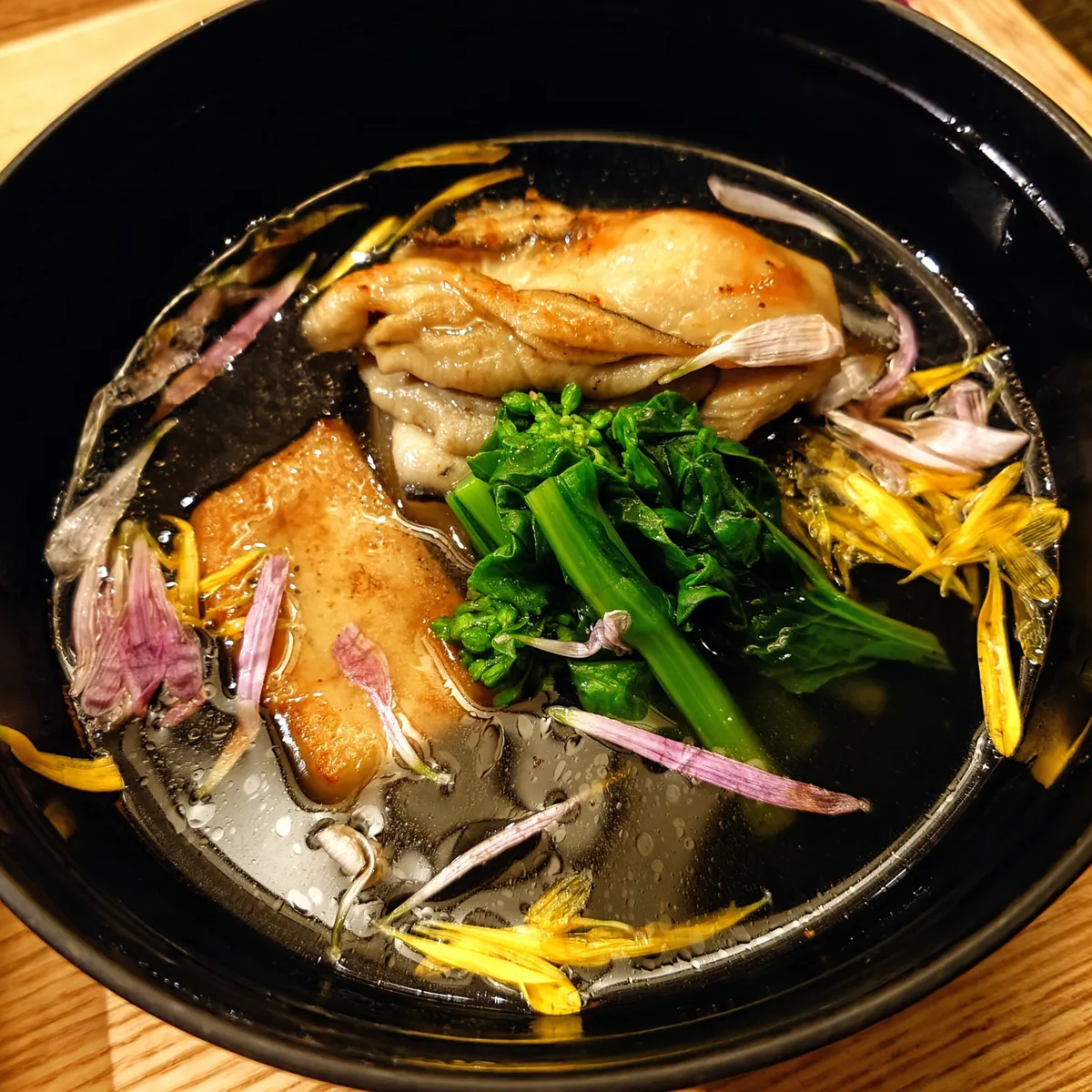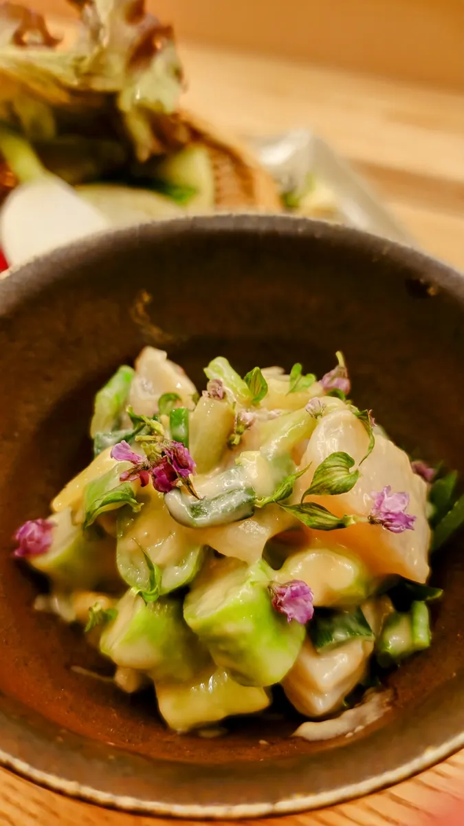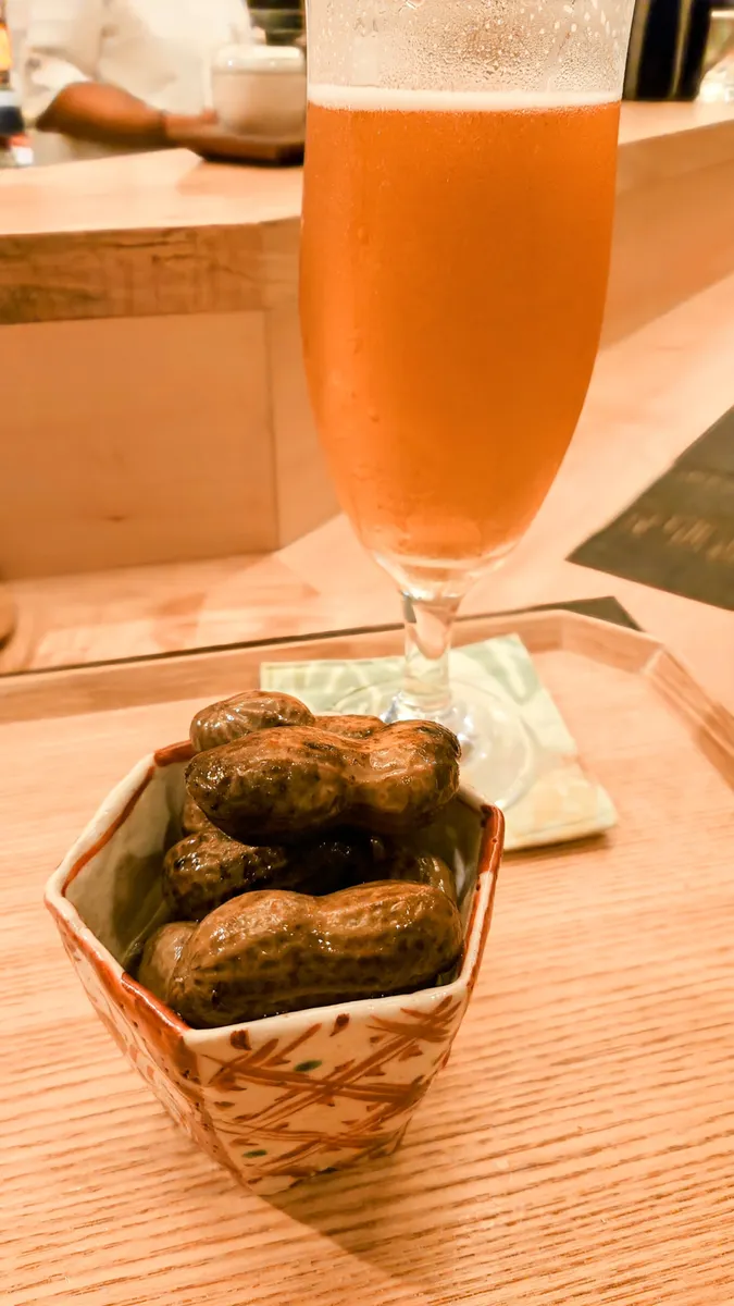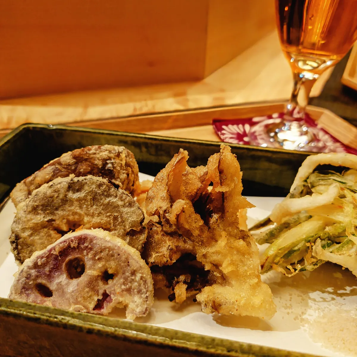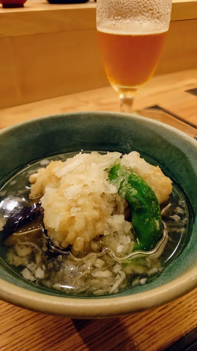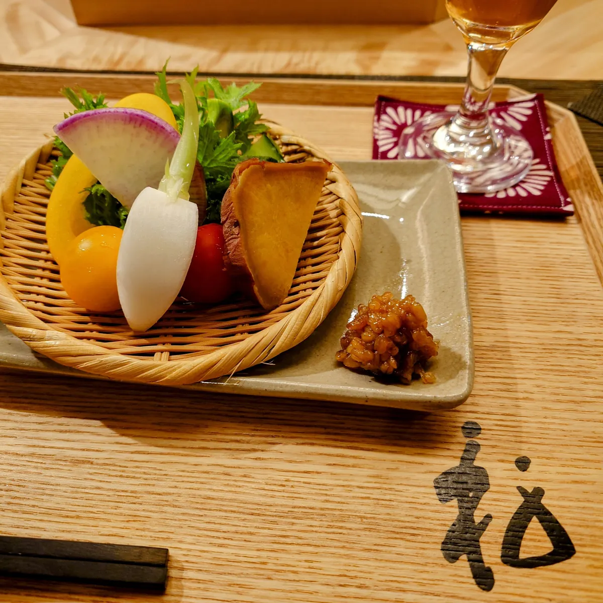 お通しはとよまさりの豆乳と手作り豆腐と有機野菜の盛合せ。ヱビスビールとの夜がスタートします