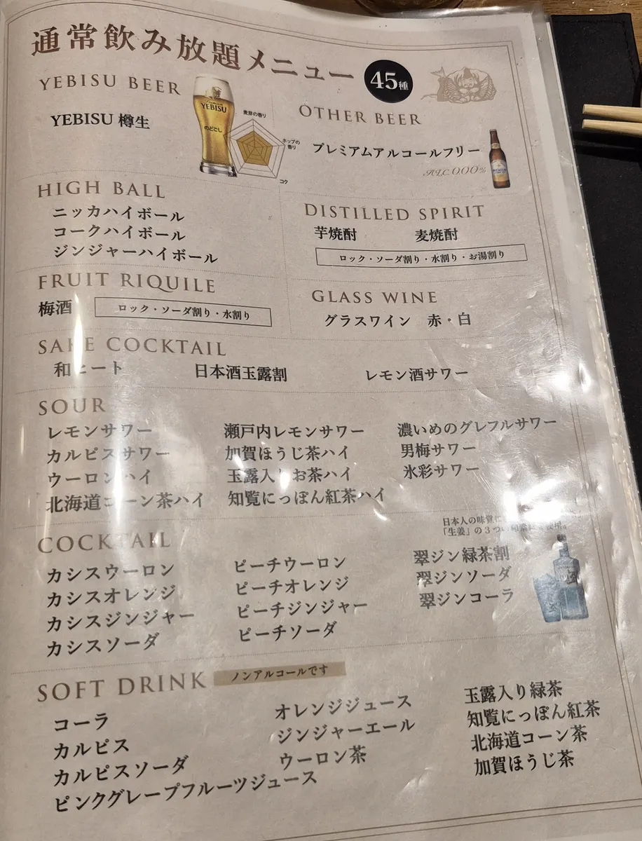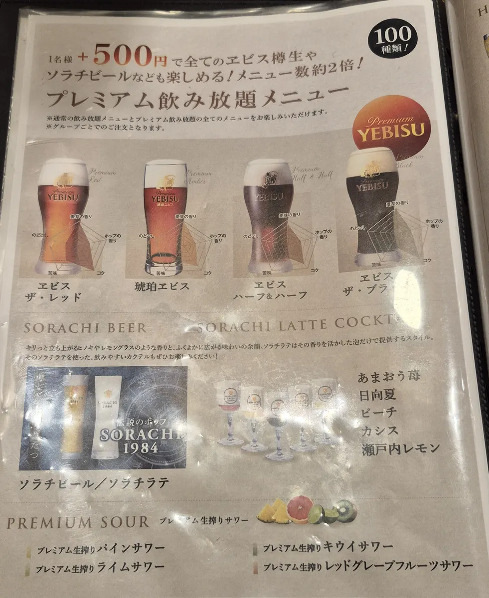 ↑↑↑通常飲み放題コースに1名様500円を追加すると,ソラチやヱビスブラックや琥珀ヱビス等も飲み放題になる“プレミアム飲み放題”を利用できます♡