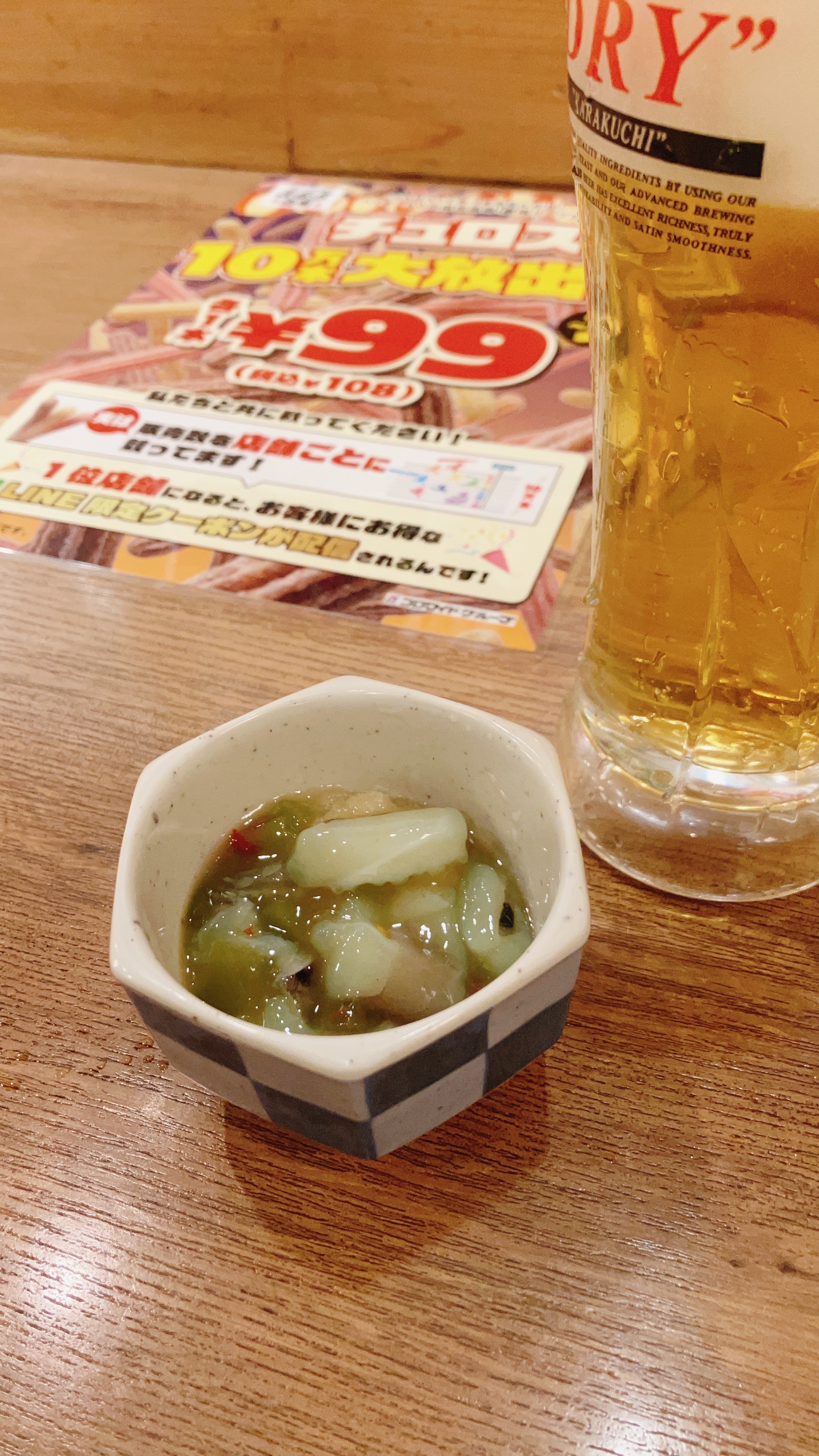 1本99円!安っ!スイーツ男子倶楽部のワタシにとっては堪らない祭だ。プレーン、いちご、キャラメルがありますが、ベーシックなプレーンを頂きました。甘すぎず程よい甘さがグーです。ハイボールでなくともビールとも合いますよ。二番目のアテは大好きなたこわさ!旨し!三番目は安定の冷奴す。