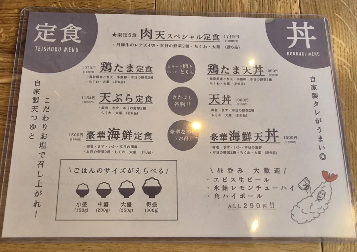 ↑↑↑ランチの天ぷら(肉天スペシャル,豪華海鮮)とヱビス♪︎~。妻と伺い,2種類の定食を注文し,シェアしました。↓↓↓