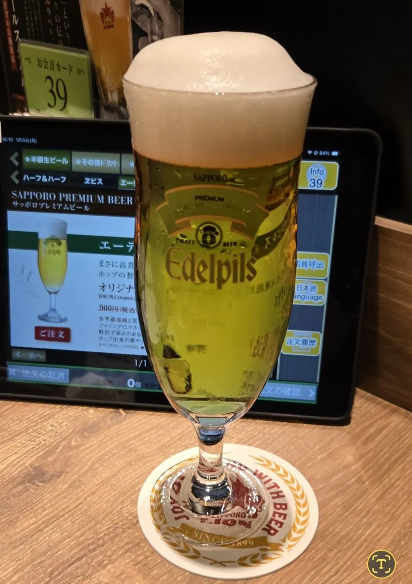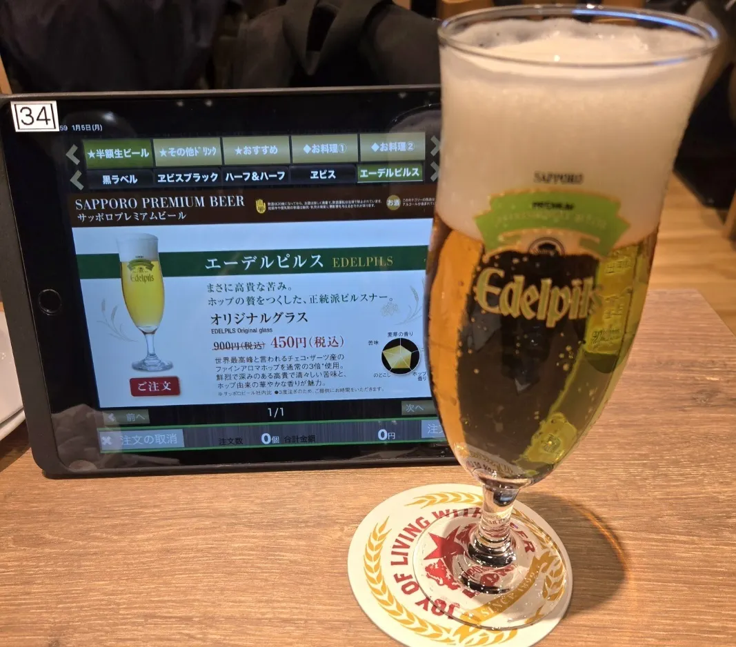隣の老夫婦が1時間程度で帰り、隣の席が空きました。そうしたら副部長が来て、○○さんすみません、次にお待ちのお客様が4名なので、席の移動をお願いできますか?と。快諾して移動しました😊そしたら副部長からビール1杯ご馳走になりました🍺何でも良いと言われたので、エーデルピルスにしました😅ありがとうございます🙇