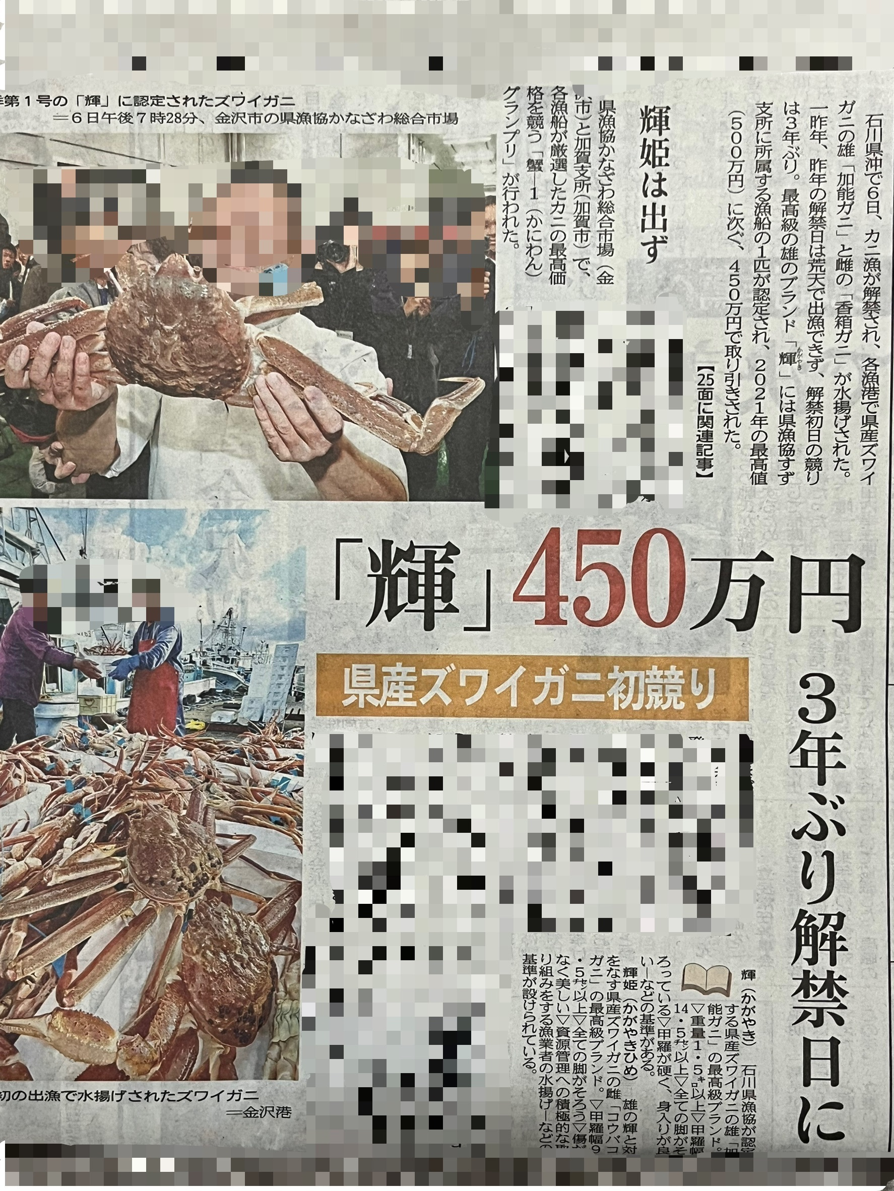 3年ぶりの初日のセリで 水揚げされた33,894匹の 加能ガニ(ズワイガニ)の中から 雄の最高級ブランドの「輝」が たった一匹だけ認定され、なんとそのお値段驚くなかれ¥4,500,000‼️😳🫢 地元の高級旅館が落札 本日宿泊客へ大盤振る舞い👍 (羨ましすぎる🤤が宿泊費もそれなり💦)