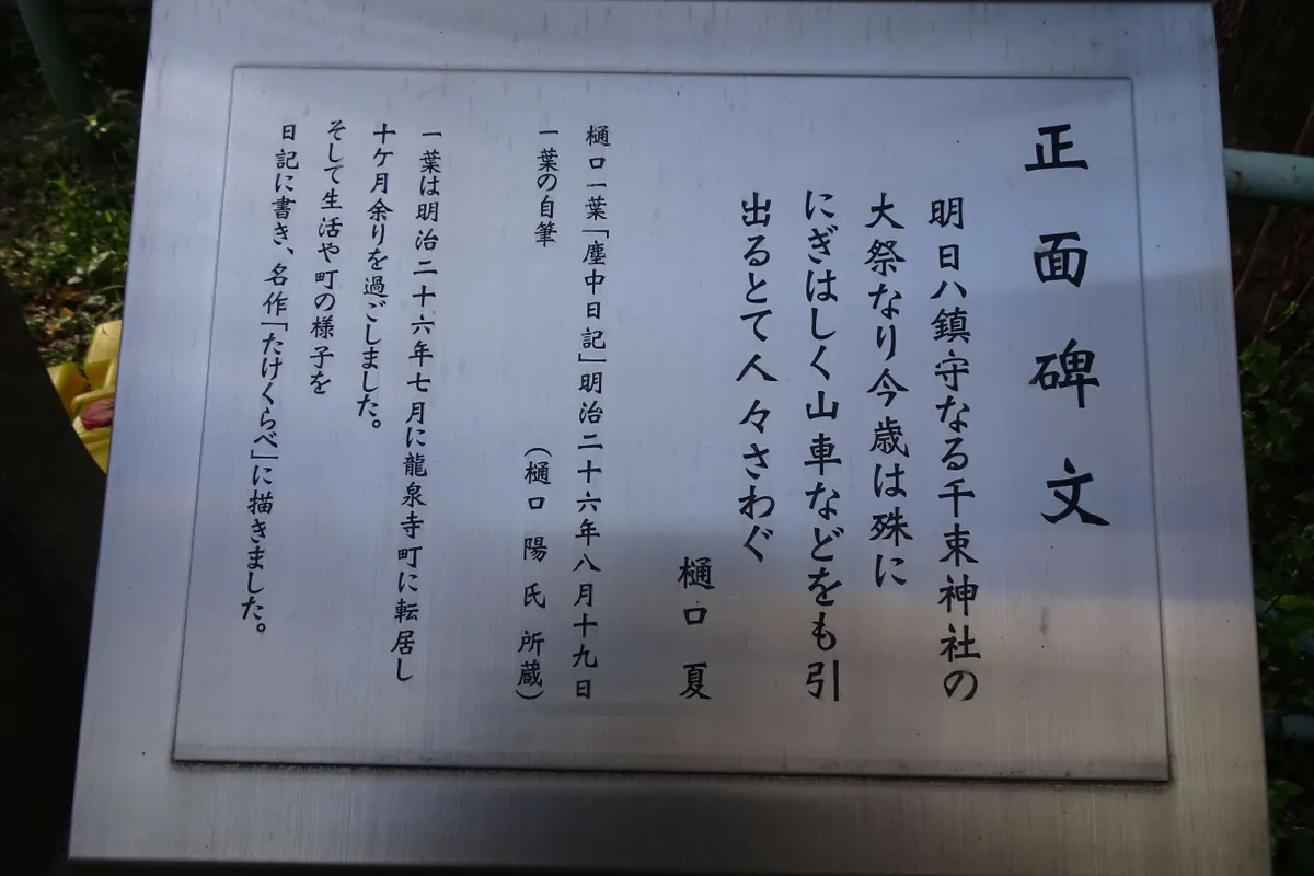 トップ > ヱビスフォト > 季節の写真 > 千束稲荷神社 なおなおっぴ 2026/01/19 22:50 千束稲荷神社 11月8日土曜の続きです。 浅草から三ノ輪に移り、三ノ輪近辺の神社を回りました。 東京メトロ日比谷線の三ノ輪駅の南側に、千束稲荷神社があります。 けっこう古そうな神社です。 手水舎です。 拝殿です。 奥に見えるのが本殿です。 樋口一葉の像がありました。 この辺りに住んでいたことがあるそうです。 いいね 共有する 共有する X facebook LINE リンクをコピー コメントする 1 件の返信 (新着順) ミュートしたユーザーの投稿です。 投稿を表示 legacy 2026/01/20 17:15 神社は渋くていいんですけど周りが高層ビルっていうのが、いかにも東京ぽいですよね、へー😎👍👏。 いいね 返信する ミュートしたユーザーの投稿です。 投稿を表示 なおなおっぴ 2026/01/20 22:58 legacyさん 東京ではおっしゃる通りこういう景色が多いですね。 いいね 返信する