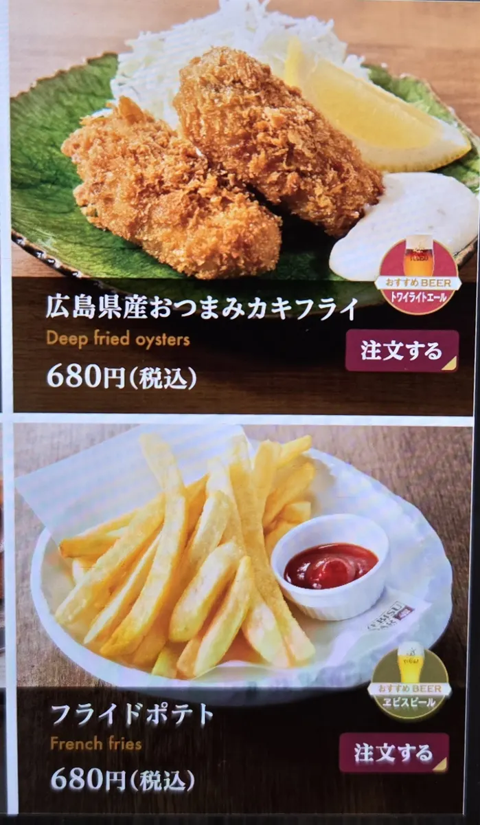 ヱビスバー🍺税込み680円メニュー、しかも王道的なメニューばかりです😊