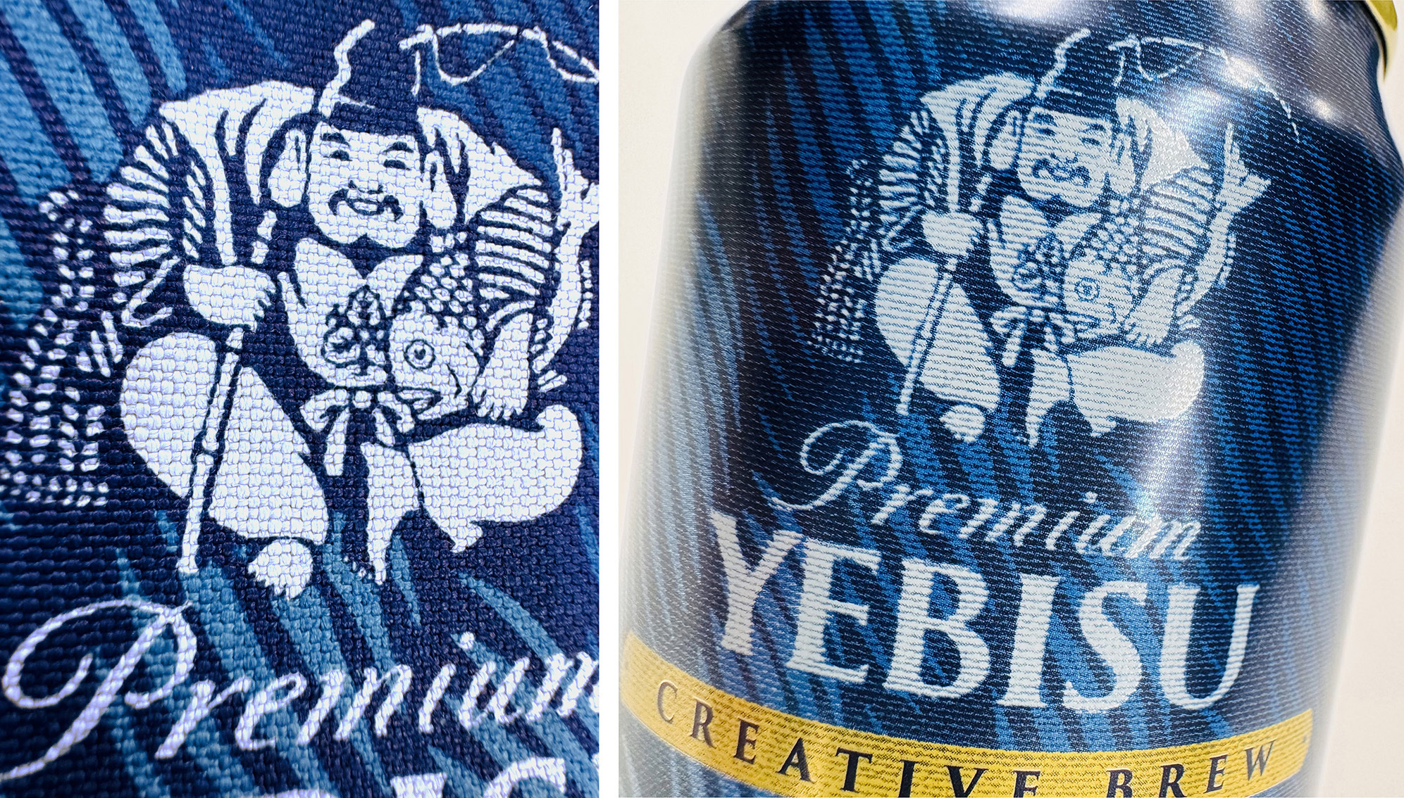 缶を手にしてぜひご確認いただきたいのが、メインのヱビス様部分です。 そうなんです。ヱビス様、Premium YEBISUロゴ、商品名の全てが実際に藍染作品として再現されているんです。背景に藍染の布の画像を敷いて、上からロゴデータをポンと乗せたのではないんです。