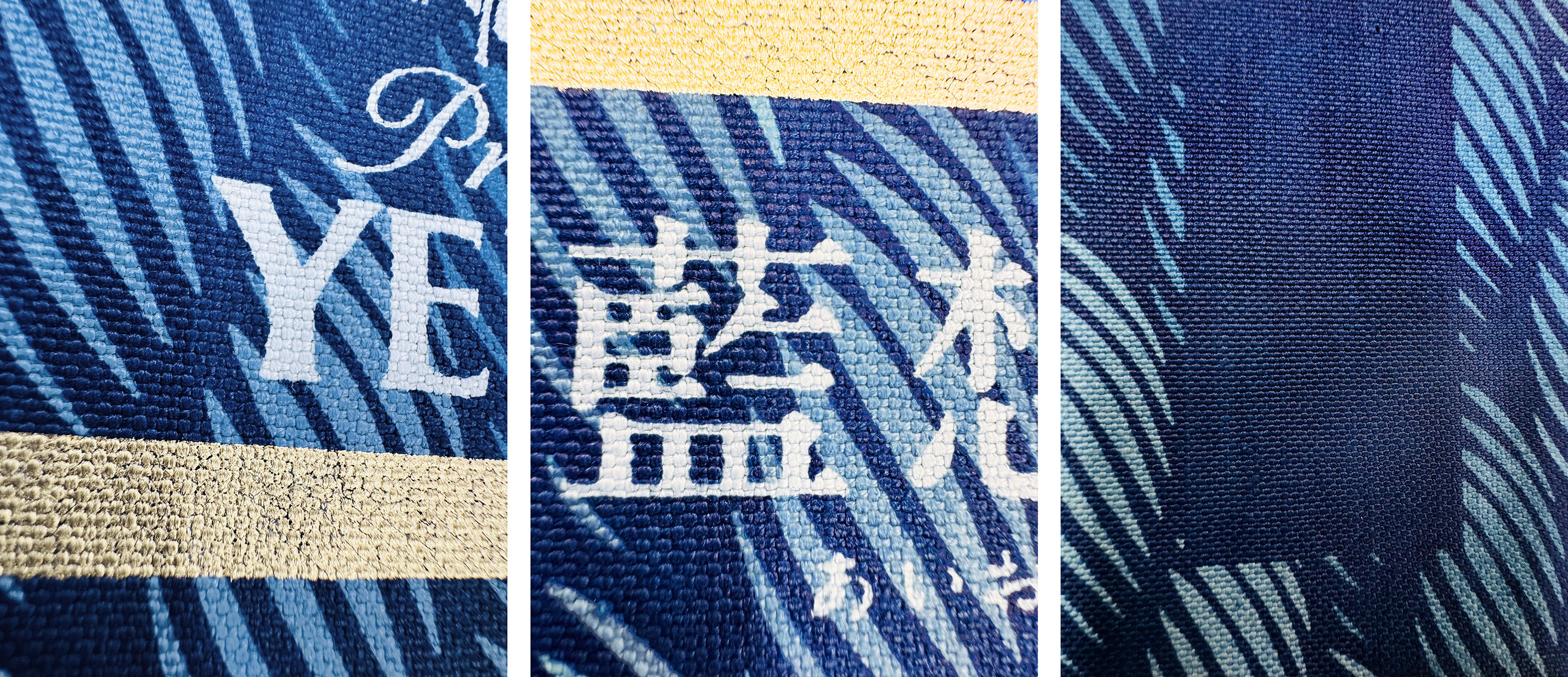 藍染の制作に入る前に何度か打ち合わせをする中で、ヱビス様とかロゴも型染めで染め抜いてみたいとお話があり、チャレンジすることに。正直、柄が細か過ぎて無理なのではないか??と感じたのですが、さすがの技術力で乗り切っていただけました。CREATIVE BREWの文字が納まっている金帯部分は布地に実際に金箔を貼っていただいています。