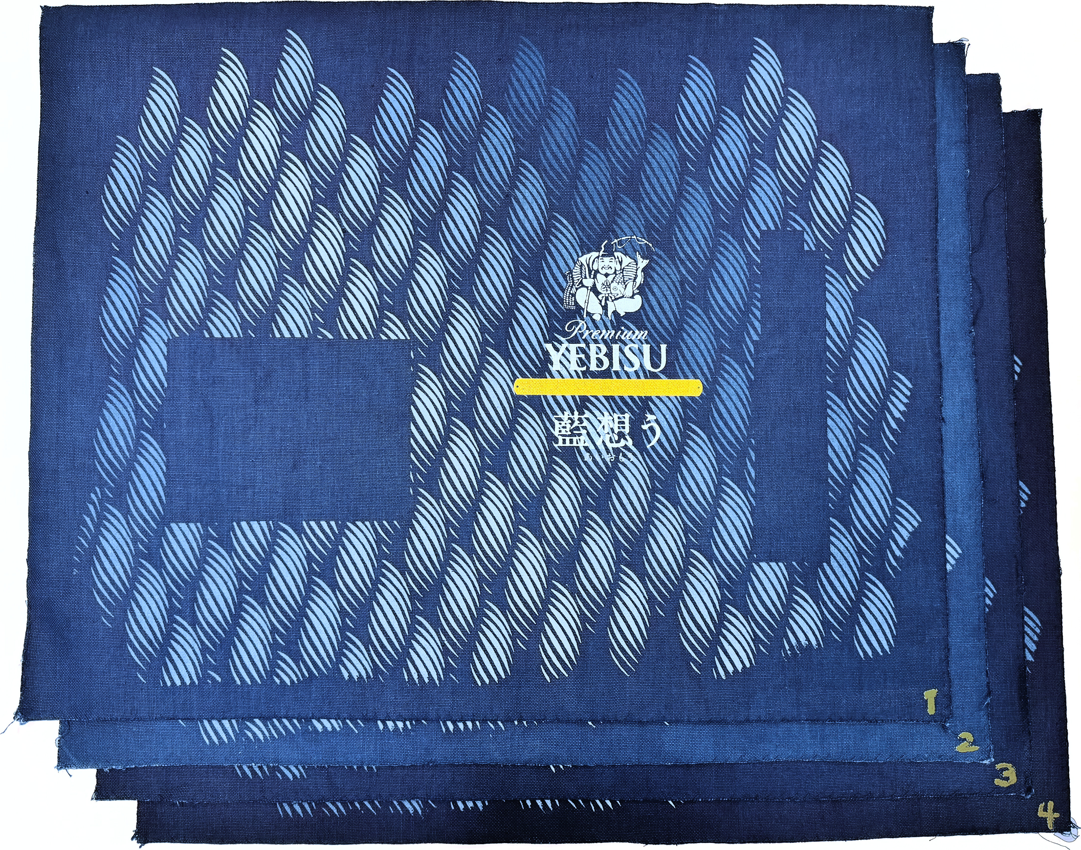 実は当初は、「ヱビス様に手を加えようという話になりはしないか」「店頭に並べにくいくらい物凄くエッジが効いた作品になったらどうしよう」という不安が無いでは無かったのですが、徳島のBUAISOU拠点を訪ね、制作風景を見学し、蓼藍の畑を眺めながらお話を聞き、作品の方向性や表現技術についてディスカッションを重ねる中で、その不安は消えていきました。コラボする相手方に非常にリスペクトがある真摯な方たちで、こちらの心が洗われるような時間でした。