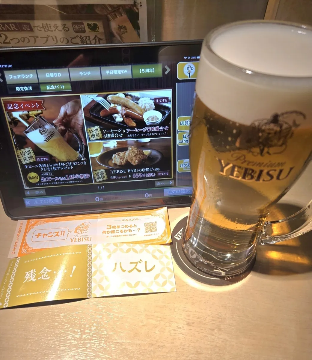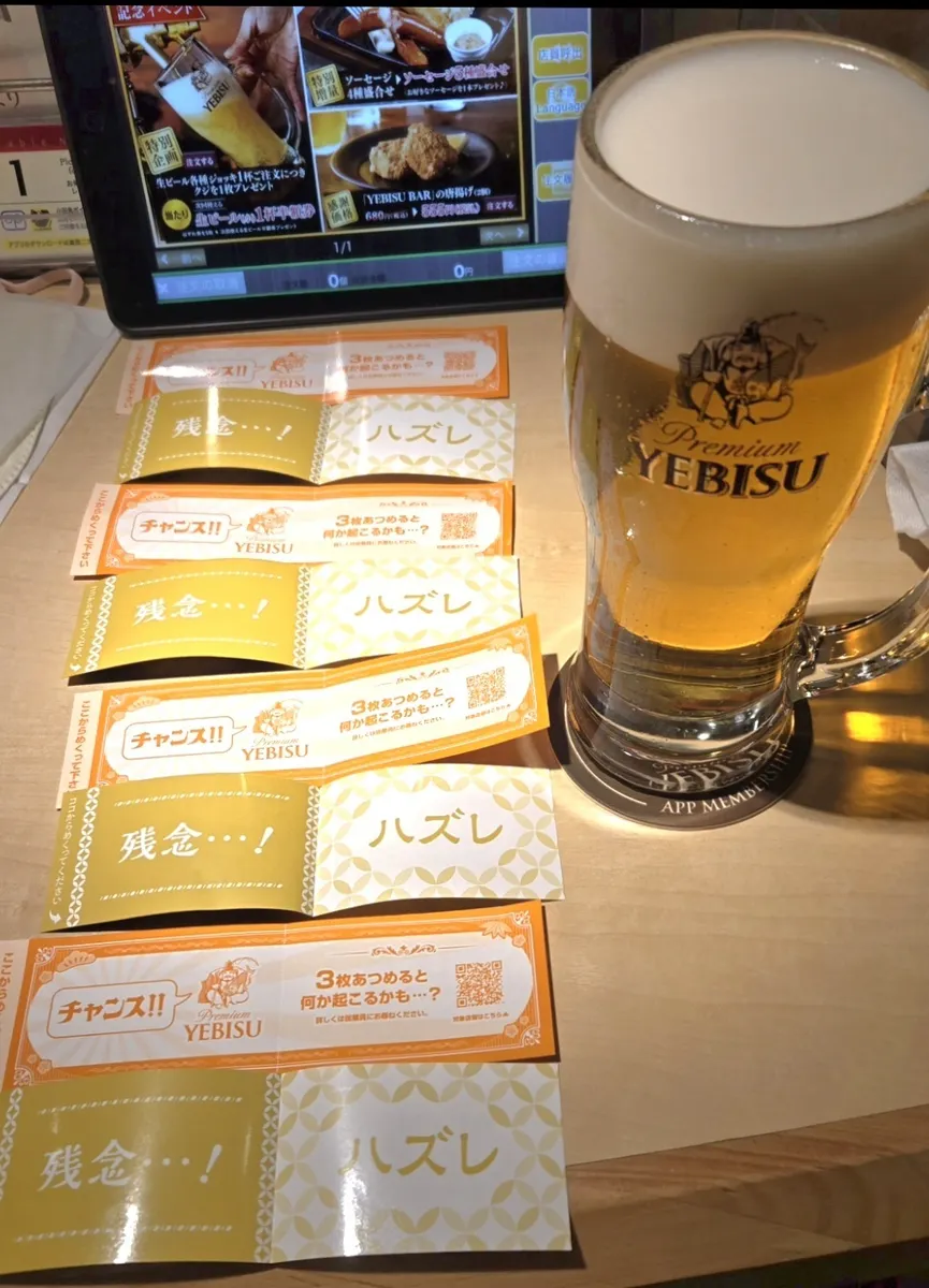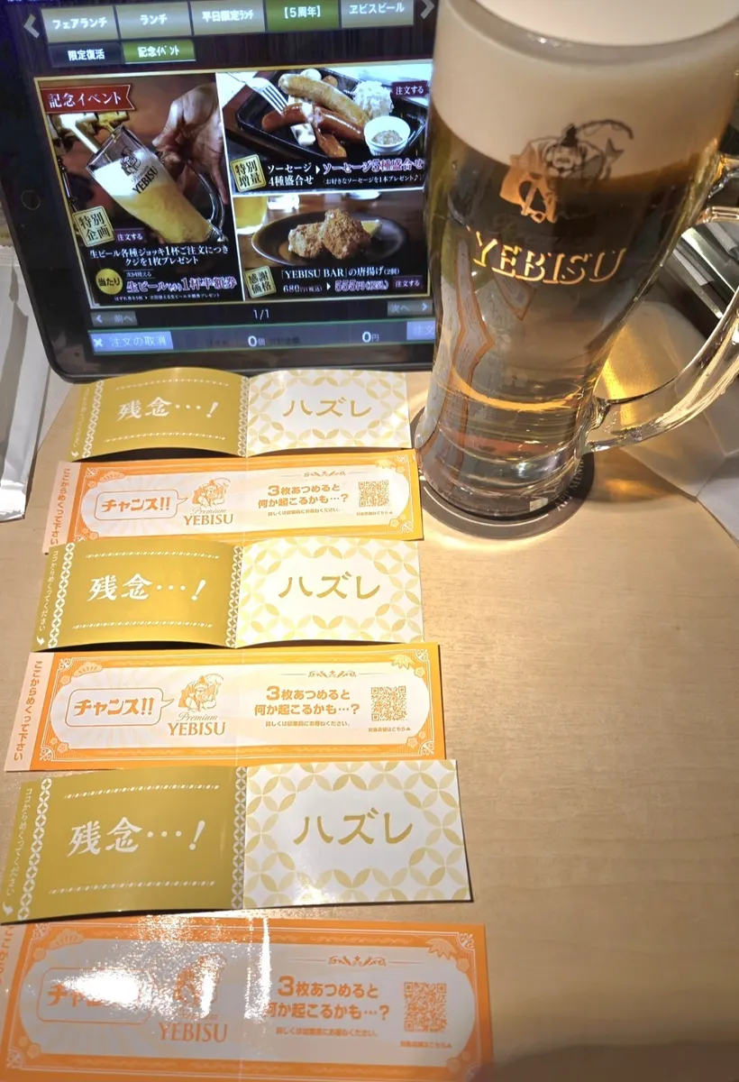 限定メニューが美味しくて、居心地も良くビールがすすみ、ジョッキ3杯飲んだところでくじは全てハズレ、当たりがでるまで帰れまテン状態で、4杯目もハズレ、ここまできたらハズレ券5枚貯めようと、5杯目は当たり🤣ここでリミッター解除で6杯目はハズレ、ハズレ券5枚貯まったけど、7杯目8杯目と注文😅