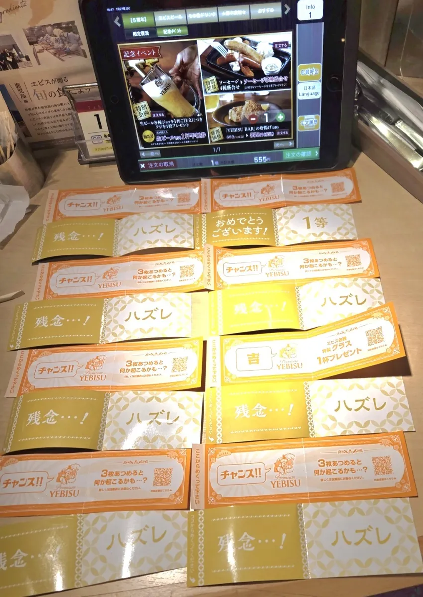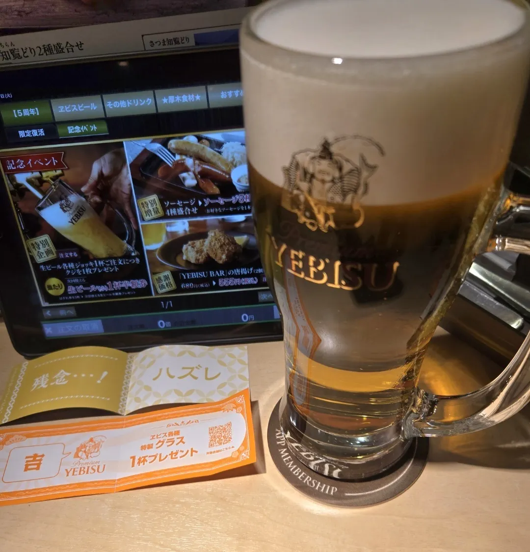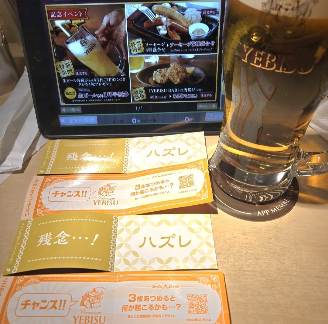 限定メニューが美味しくて、居心地も良くビールがすすみ、ジョッキ3杯飲んだところでくじは全てハズレ、当たりがでるまで帰れまテン状態で、4杯目もハズレ、ここまできたらハズレ券5枚貯めようと、5杯目は当たり🤣ここでリミッター解除で6杯目はハズレ、ハズレ券5枚貯まったけど、7杯目8杯目と注文😅