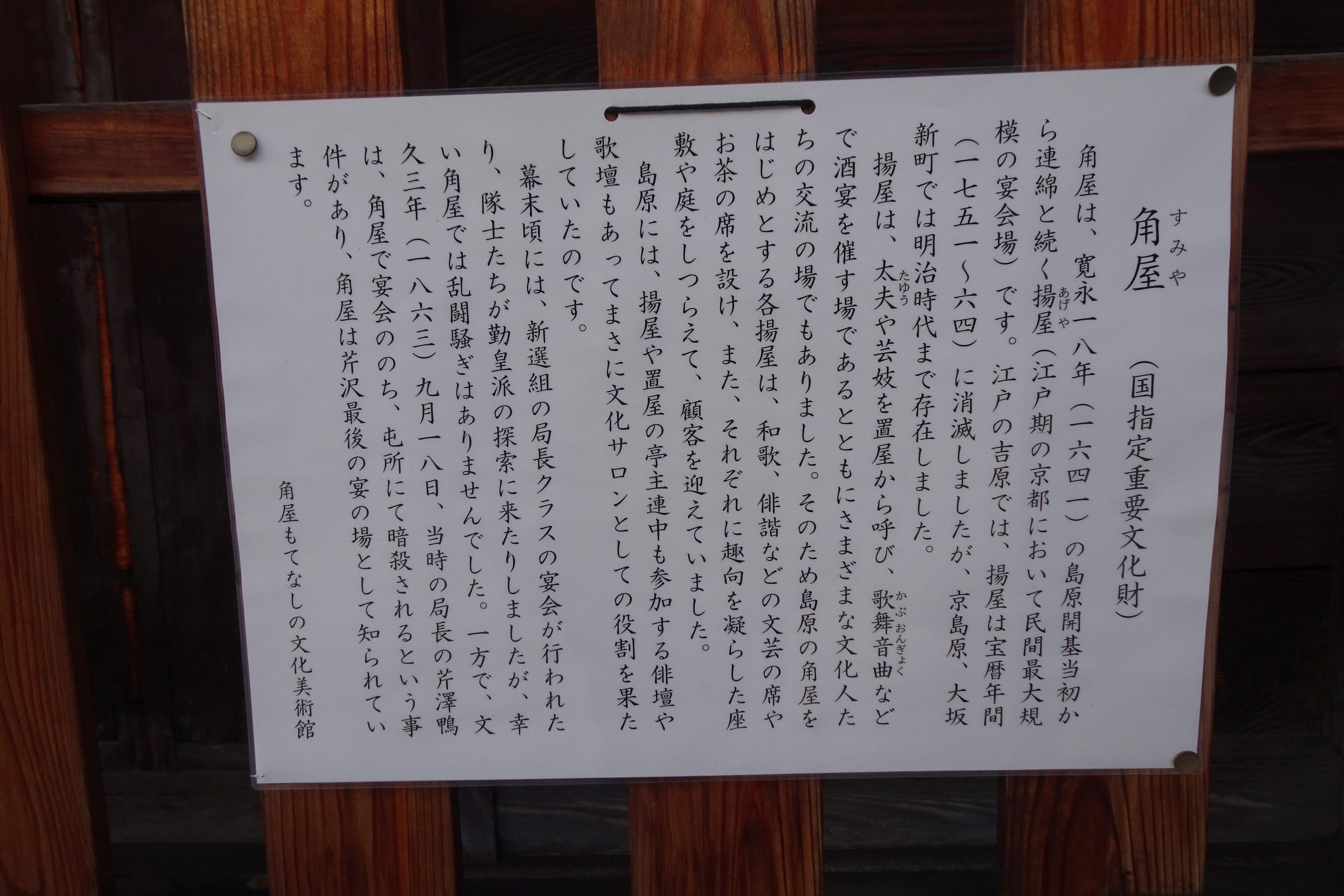 トップ > ヱビスフォト > 季節の写真 > 角屋 なおなおっぴ 2026/03/17 02:27 角屋 角屋は島原にある元料亭で、国の重要文化財です。 料亭なので、色々な人物が来て、色々やってきたようです。 正面入口です。 正面側を横から。 塀の角です。 その奥です。 敷地を考えると、とても大きい料亭です。 角屋の説明書き2種類です。 いいね 共有する 共有する X facebook LINE リンクをコピー コメントする 1 件の返信 (新着順) ミュートしたユーザーの投稿です。 投稿を表示 legacy 2026/03/17 17:29 ここ、昔、旅行で見たことありますよ、へー😎👍👏。 いいね 返信する ミュートしたユーザーの投稿です。 投稿を表示 なおなおっぴ 2026/03/17 23:47 legacyさん 立派な建物ですよね。 いいね 返信する
