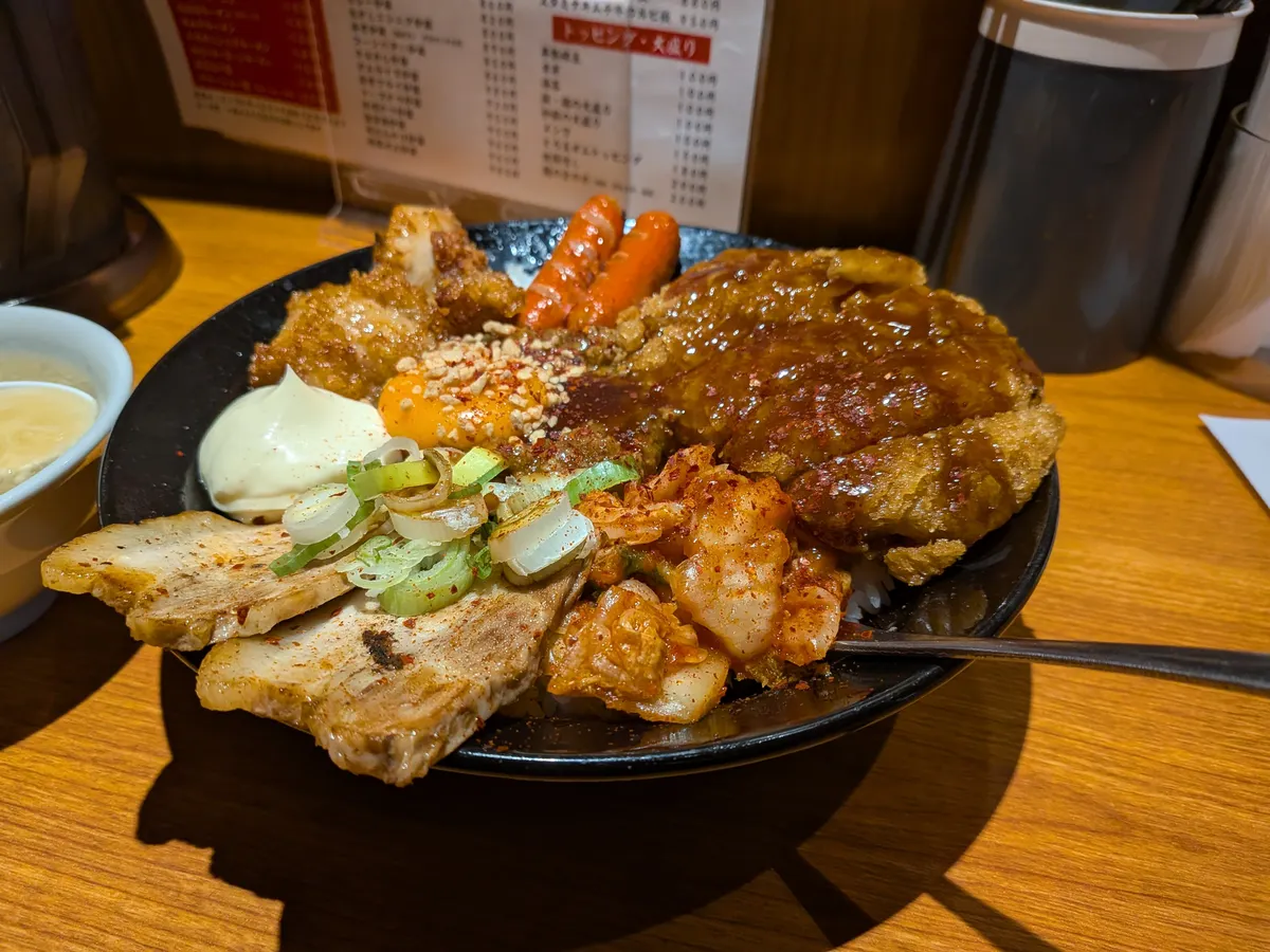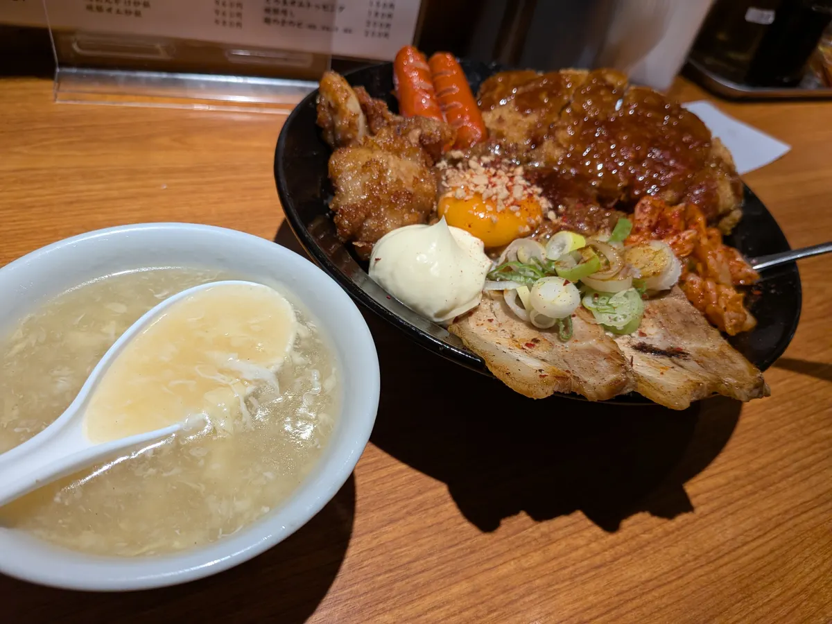 上に乗ってるのはトンカツ、赤ウインナー、唐揚げ2個、チャーシュー2切れ、キムチ、真ん中にキーマカレーの上に卵の黄身が落としてあります!あとたまごスープもついてて大満足です…!😊