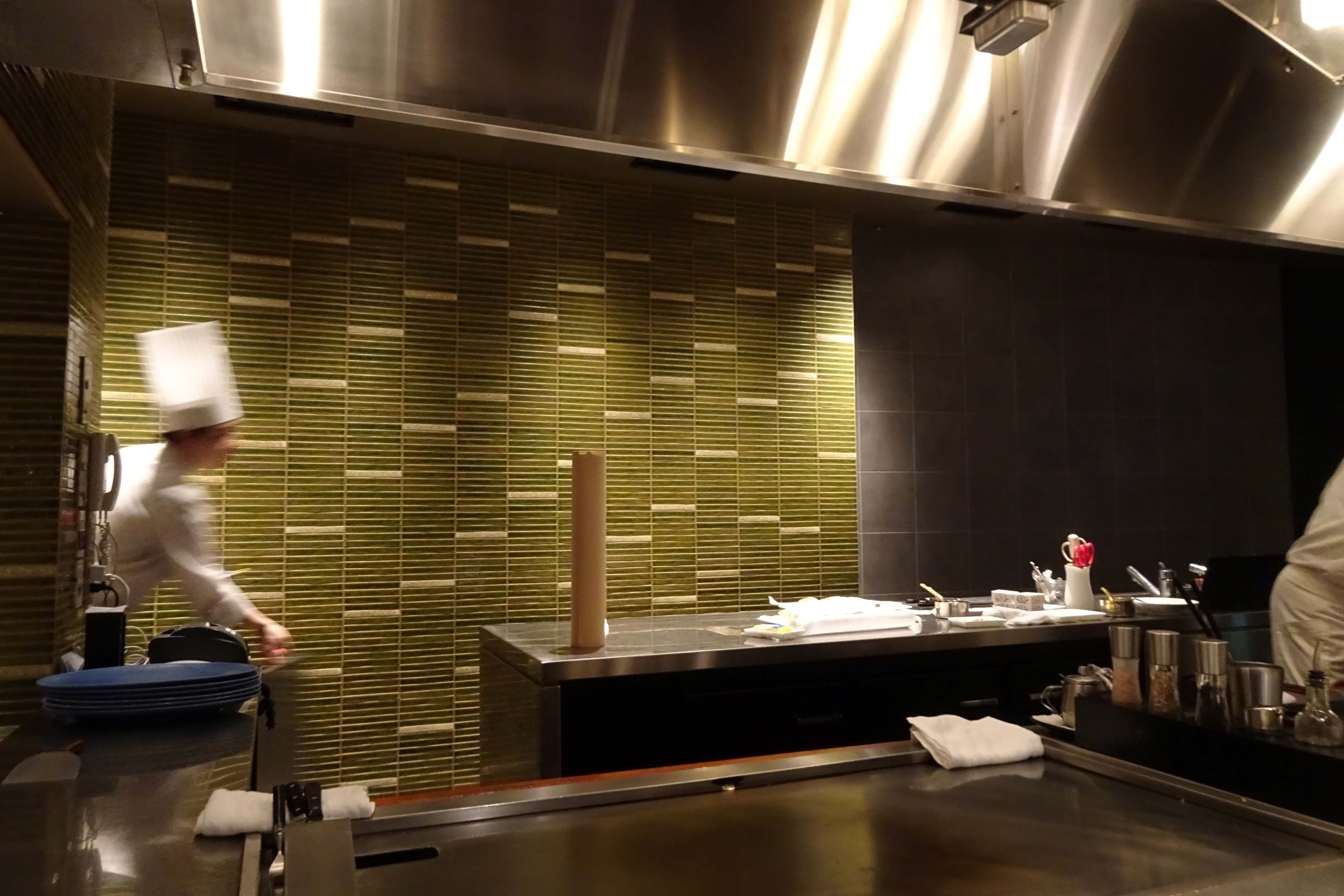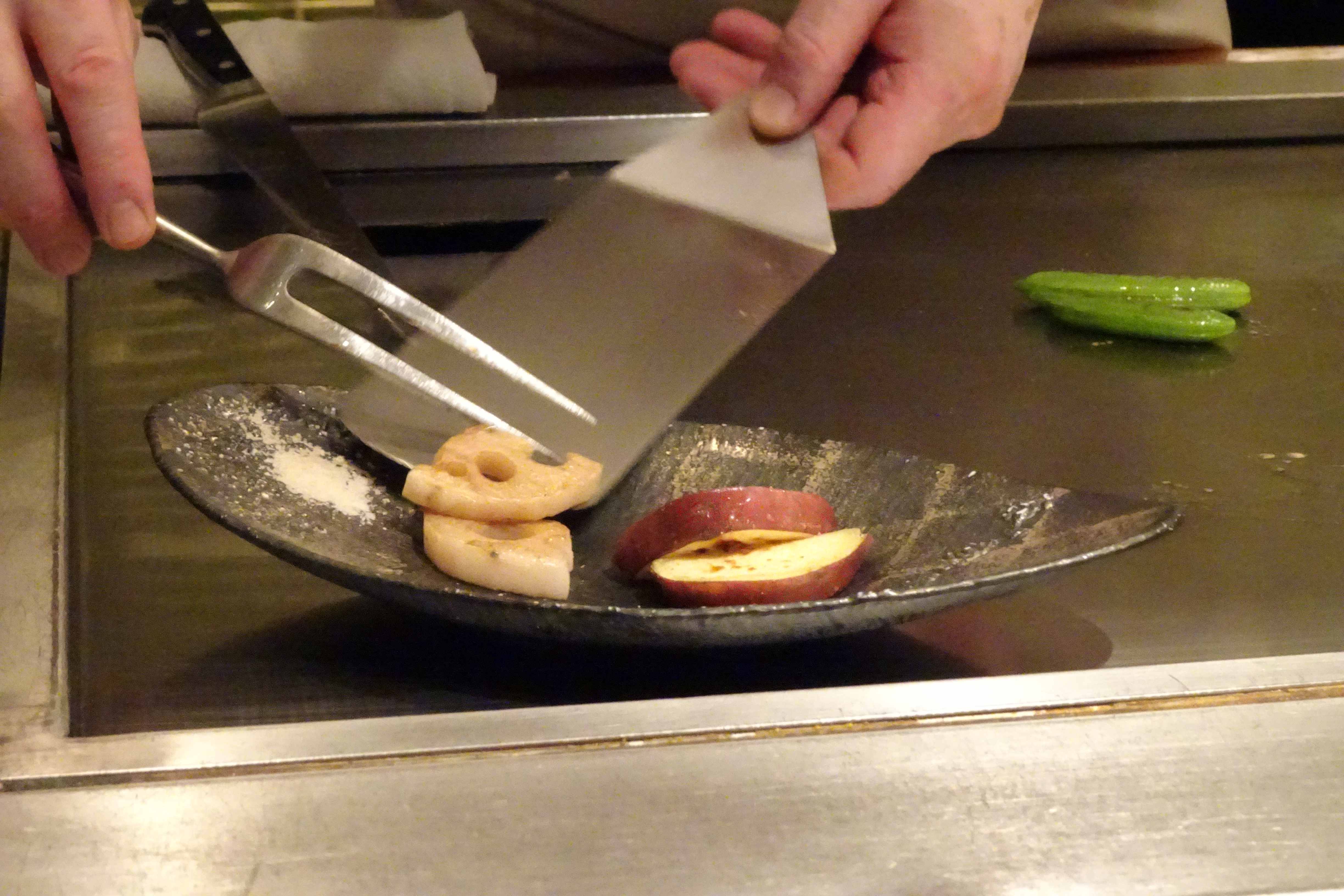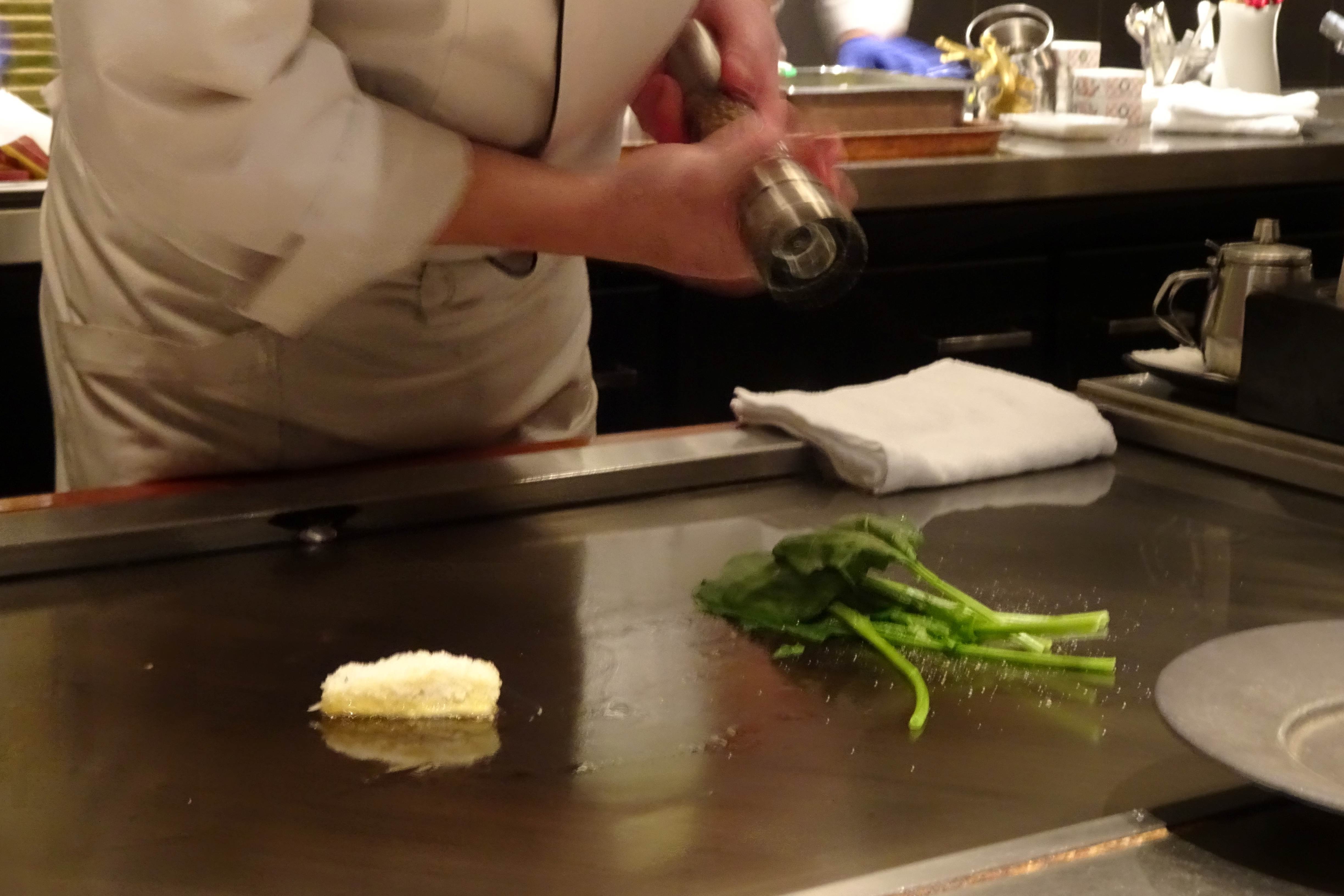 次から鉄板調理で、モンゴウイカとホウレン草を焼き始めました。