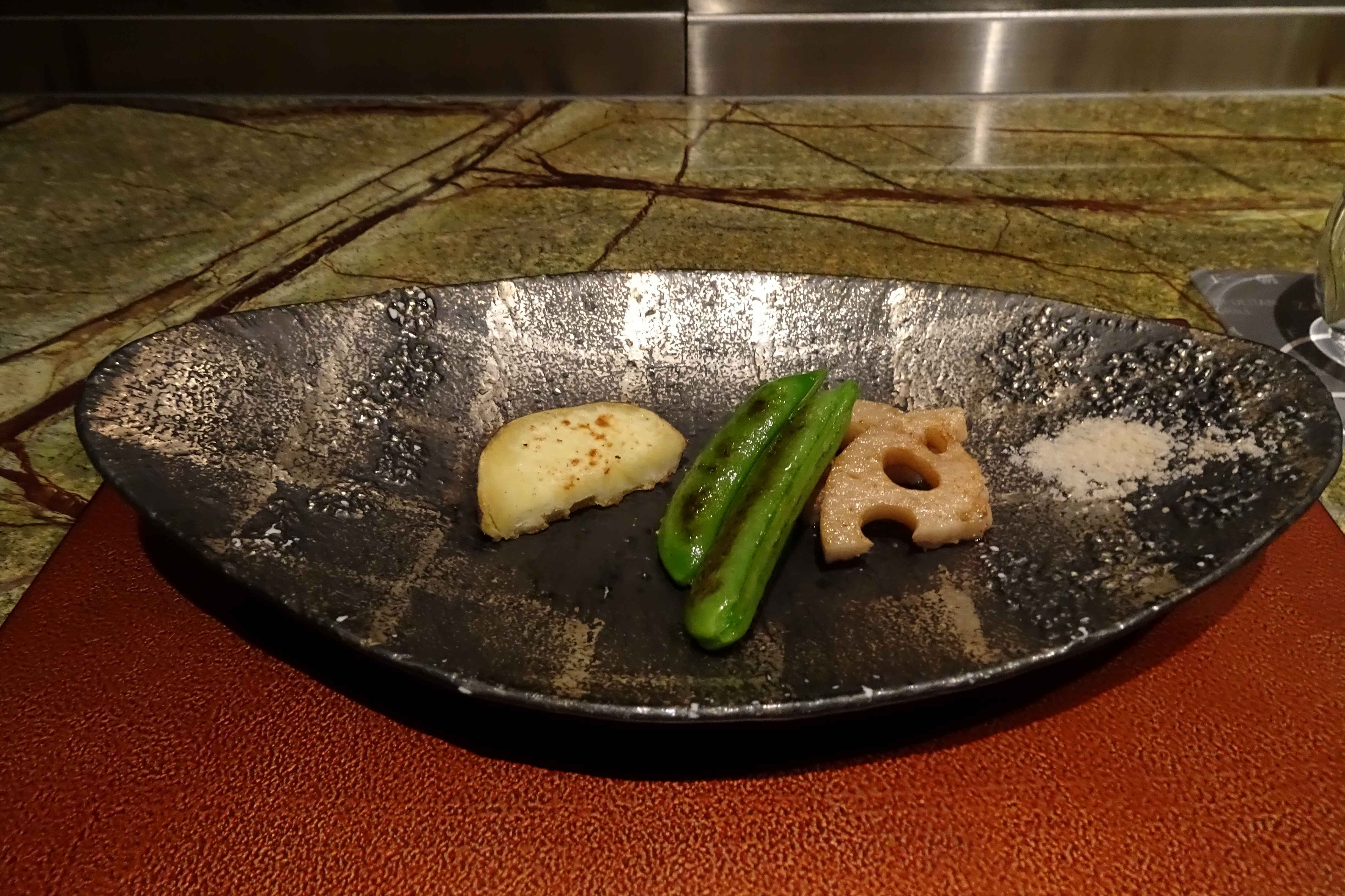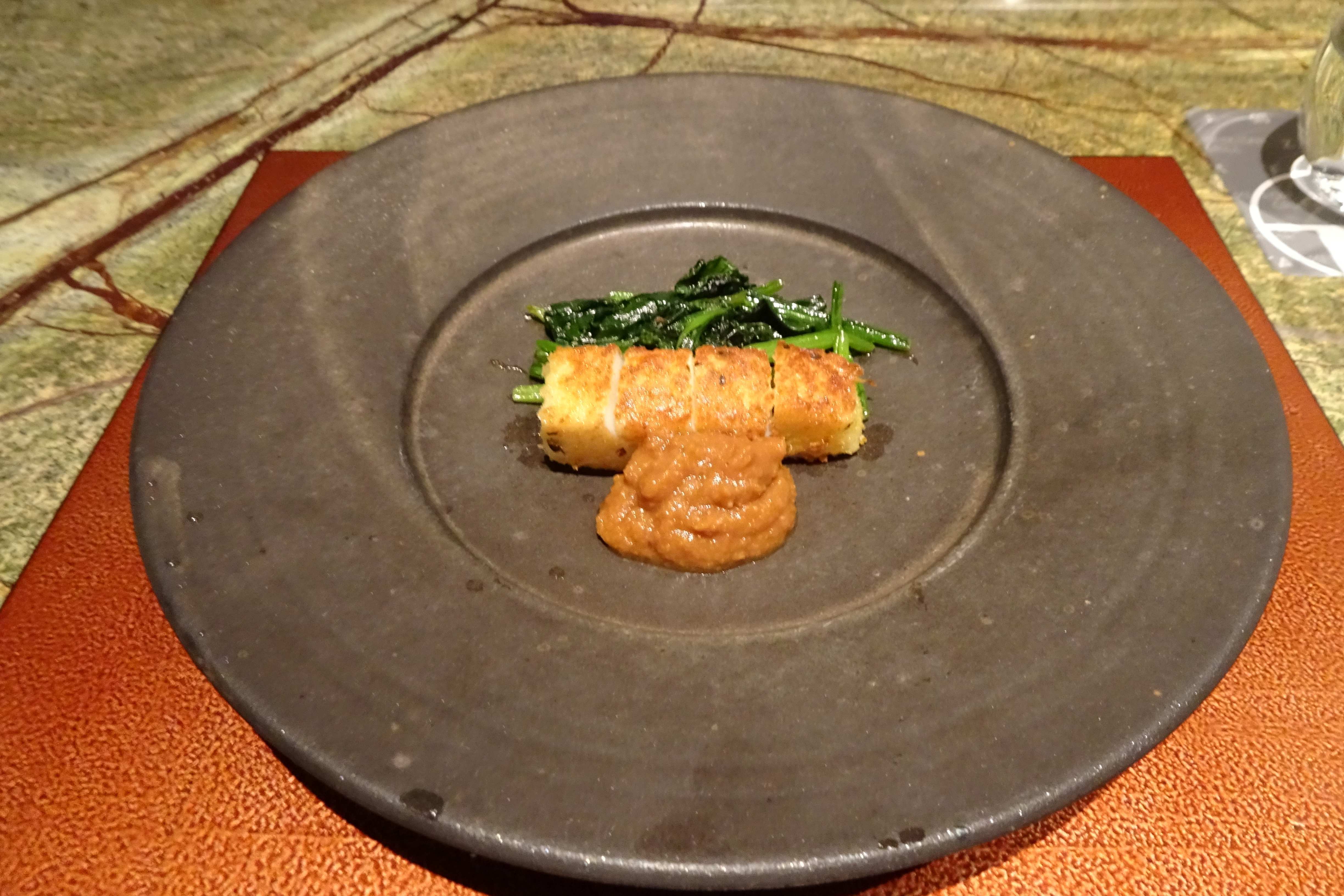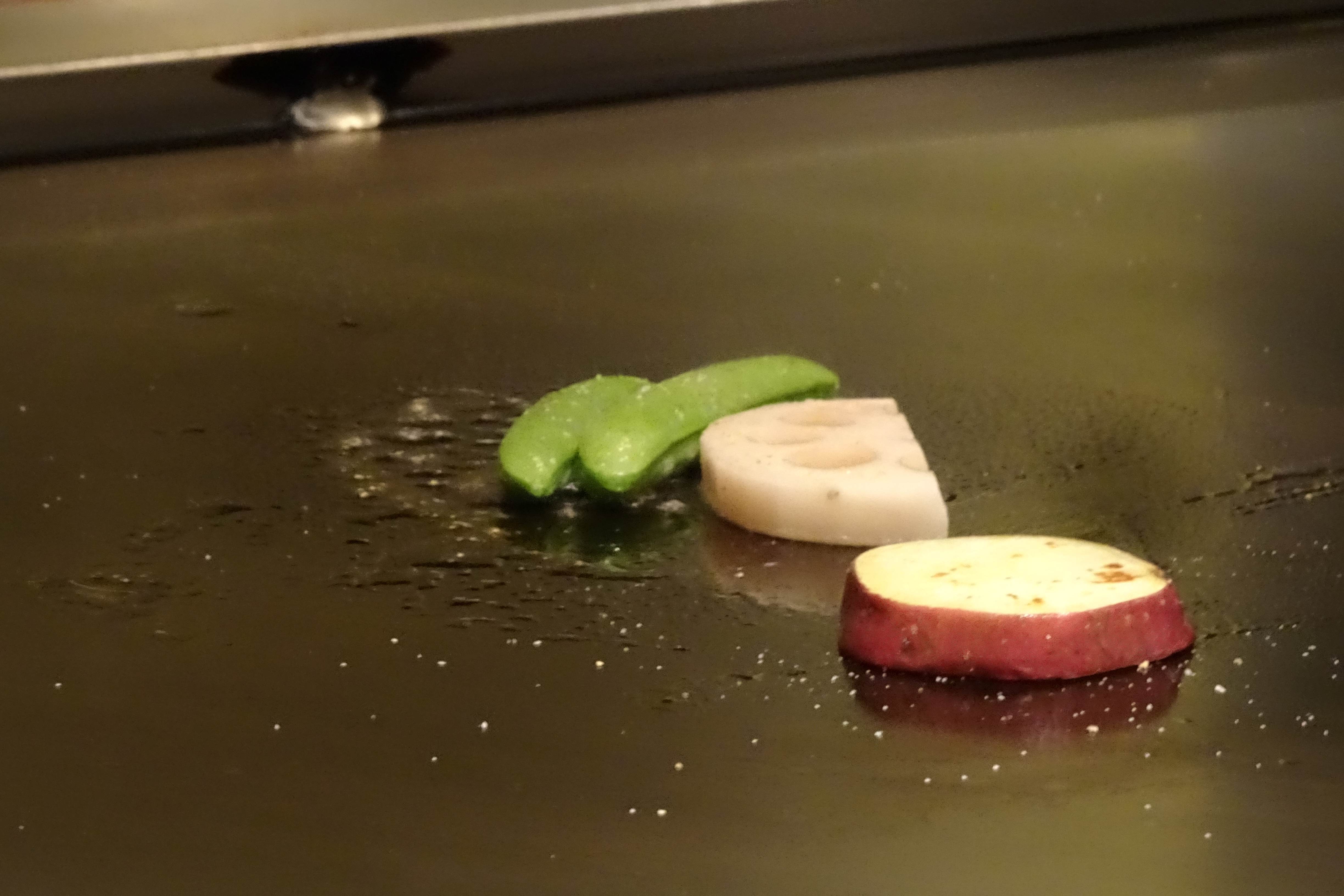 左が野菜と山形牛、右がチーズの衣をつけたモンゴウイカとホウレン草です。