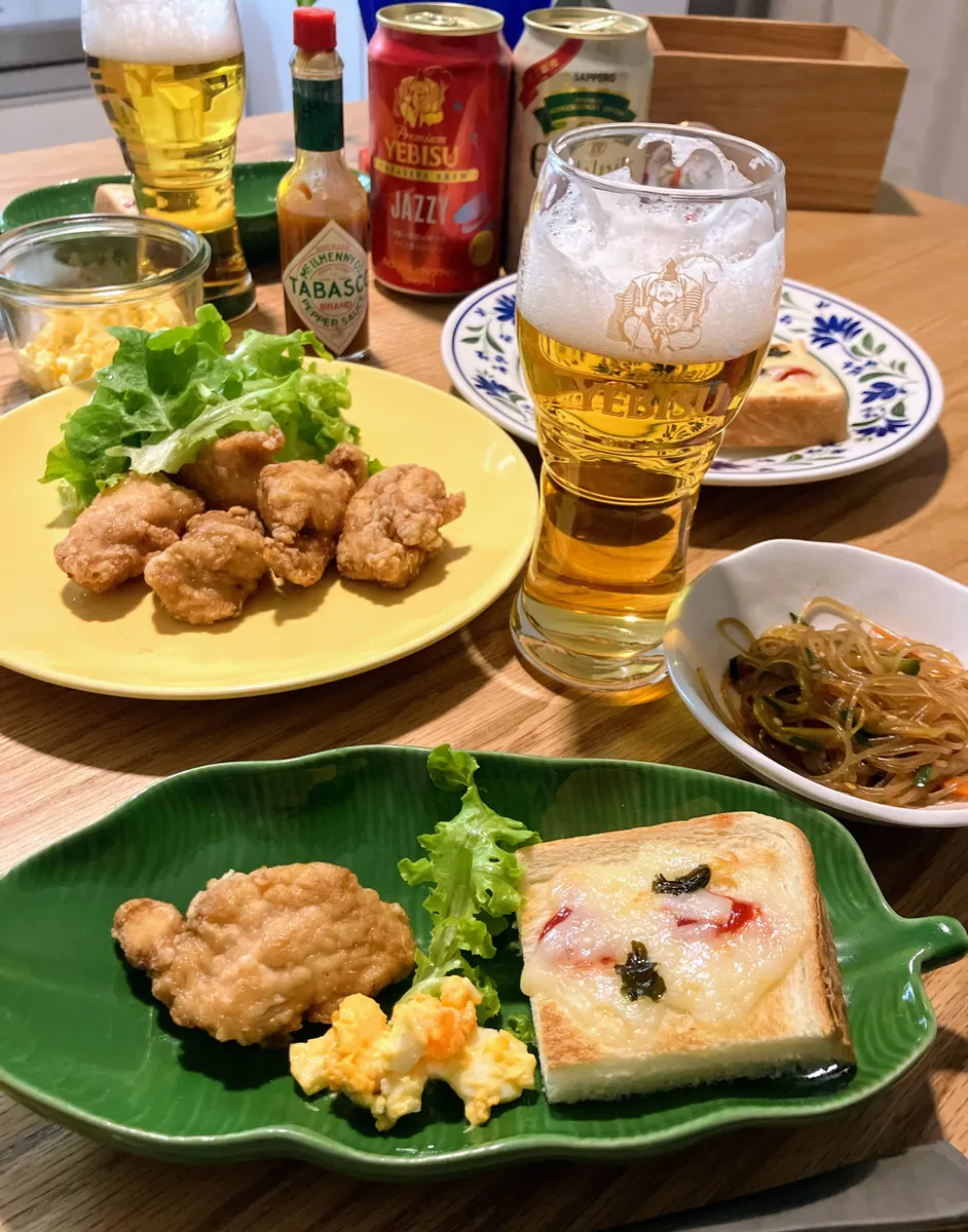 唐揚げとピザ🍕、何方もビールに合いますなぁ👍