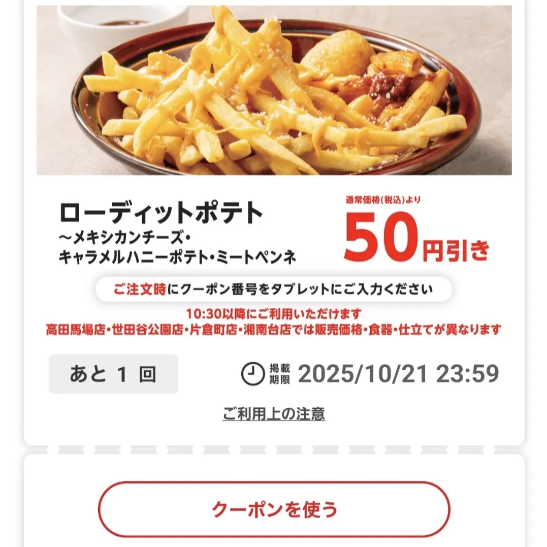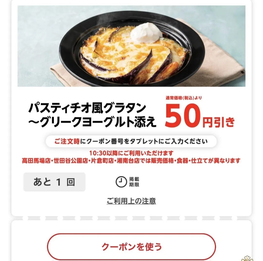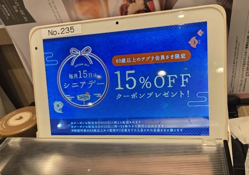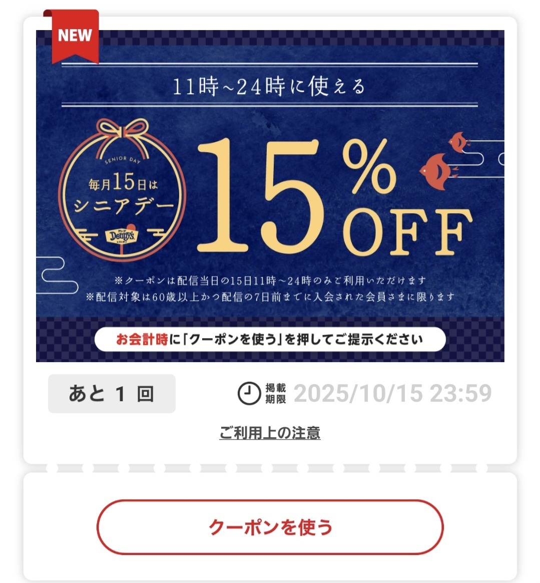 デニーズアプリ60歳以上の会員に、15日11時~24時限定15%引きクーポンが毎月届きます。
