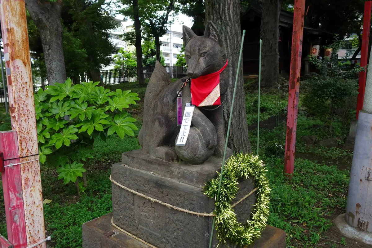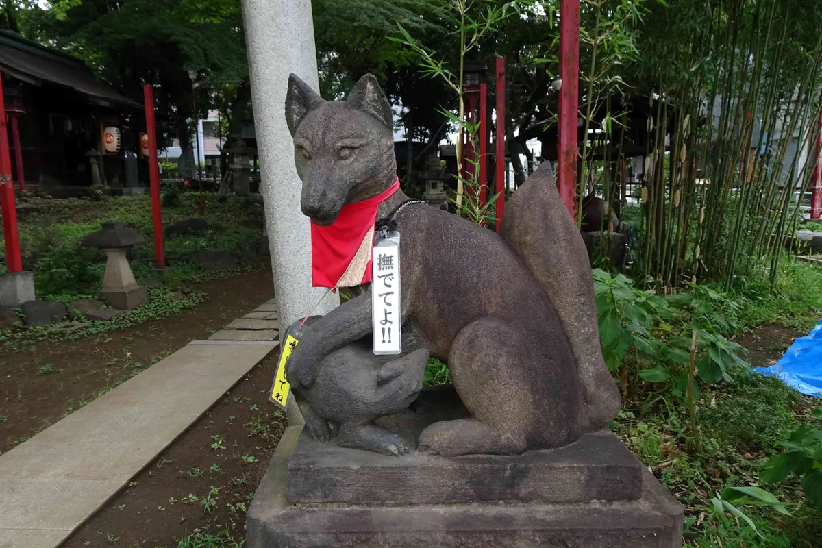 神社を守護する左右のお狐様も、無理やり撫でさせられる羽目になっています。