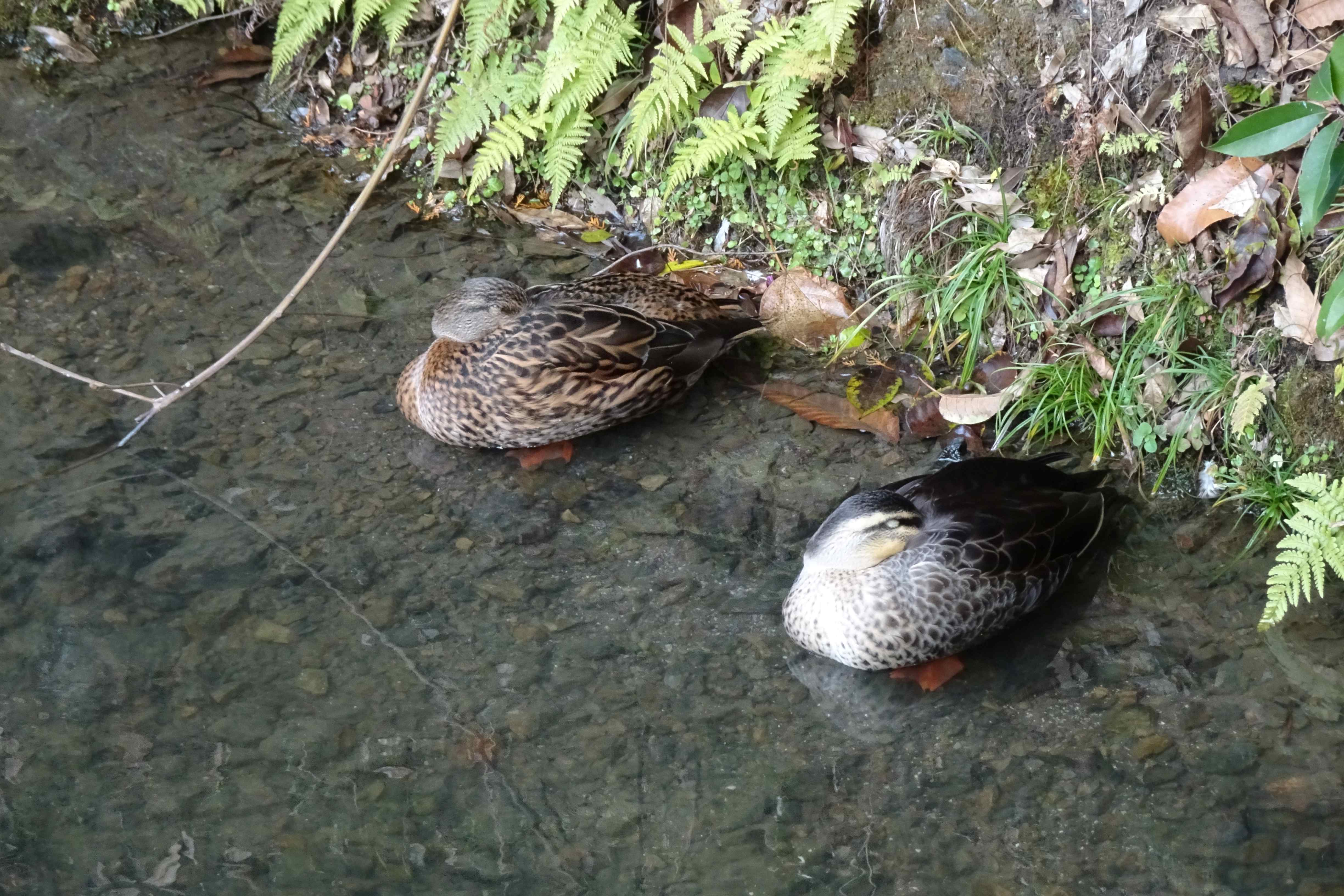カルガモが水際で休んでいます。