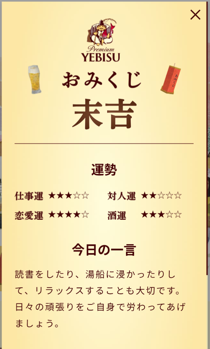 トップ > ヱビスフォト > 今日のおみくじ yurika 2025/09/19 14:13 今日のおみくじ 今日のおみくじは… 末吉 今日のおみくじ ヱビス豆知識 夏目漱石作「二百十日」 いいね 共有する 共有する X facebook LINE リンクをコピー コメントする 0 件の返信 (新着順)