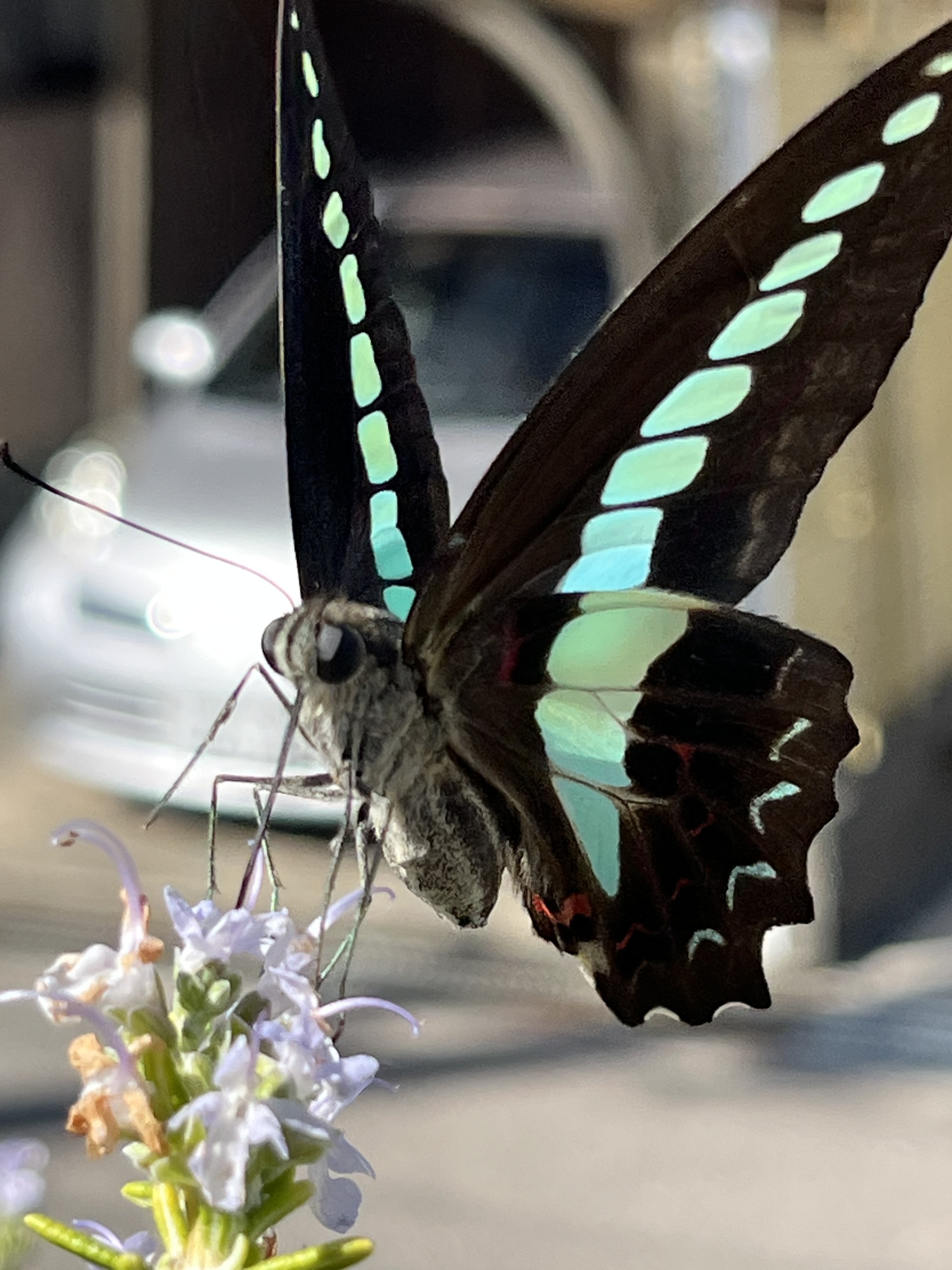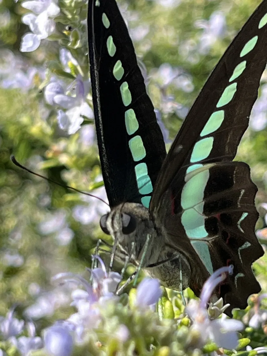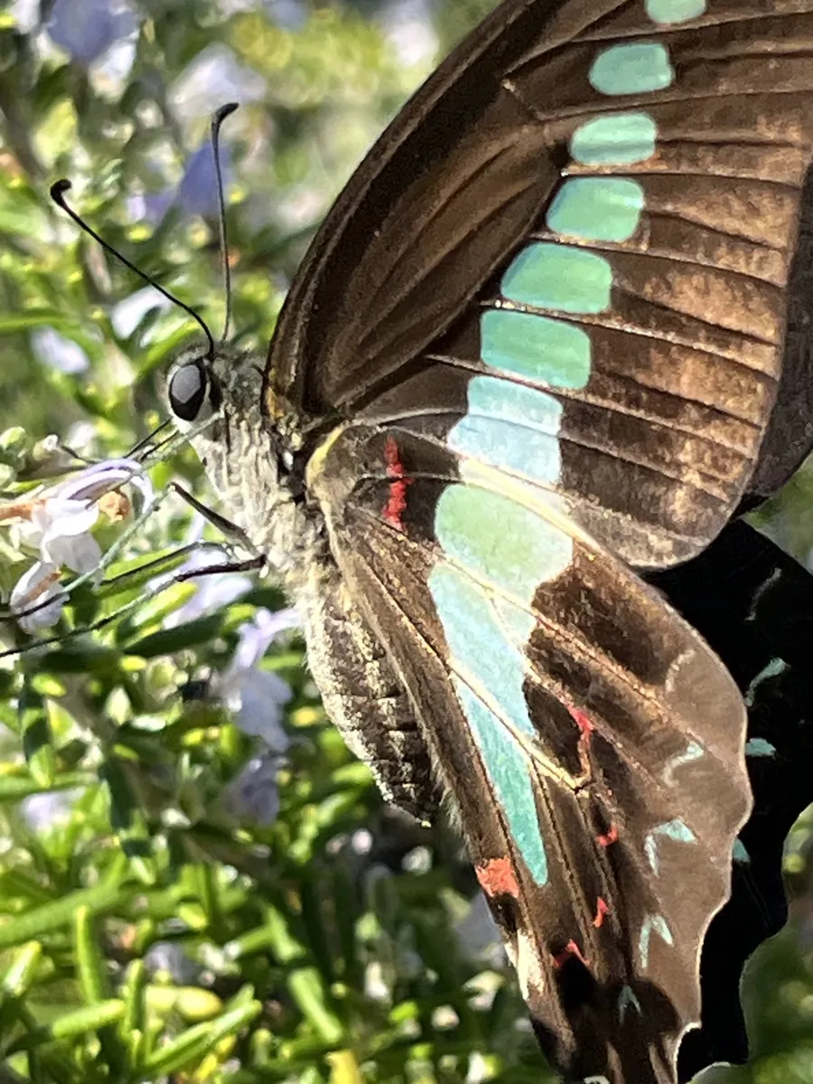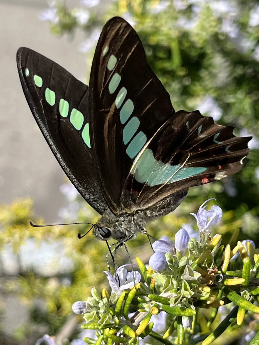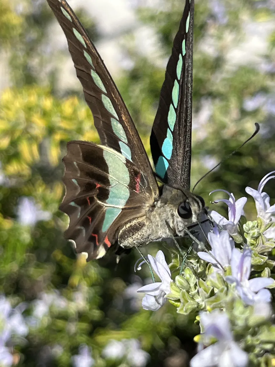我が🏠にほったらかしでも巨大化したローズマリーが今年もたくさんの ちっちゃな花を咲かせました♬ ふと見ると一匹のアオスジアゲハが蜜? (ちっちゃな花に蜜があるかどうかは😆) を求めて飛び回ってたので 思わず写真撮りまくっちゃいました! その写真がこちら👇連続でどうぞ🫱