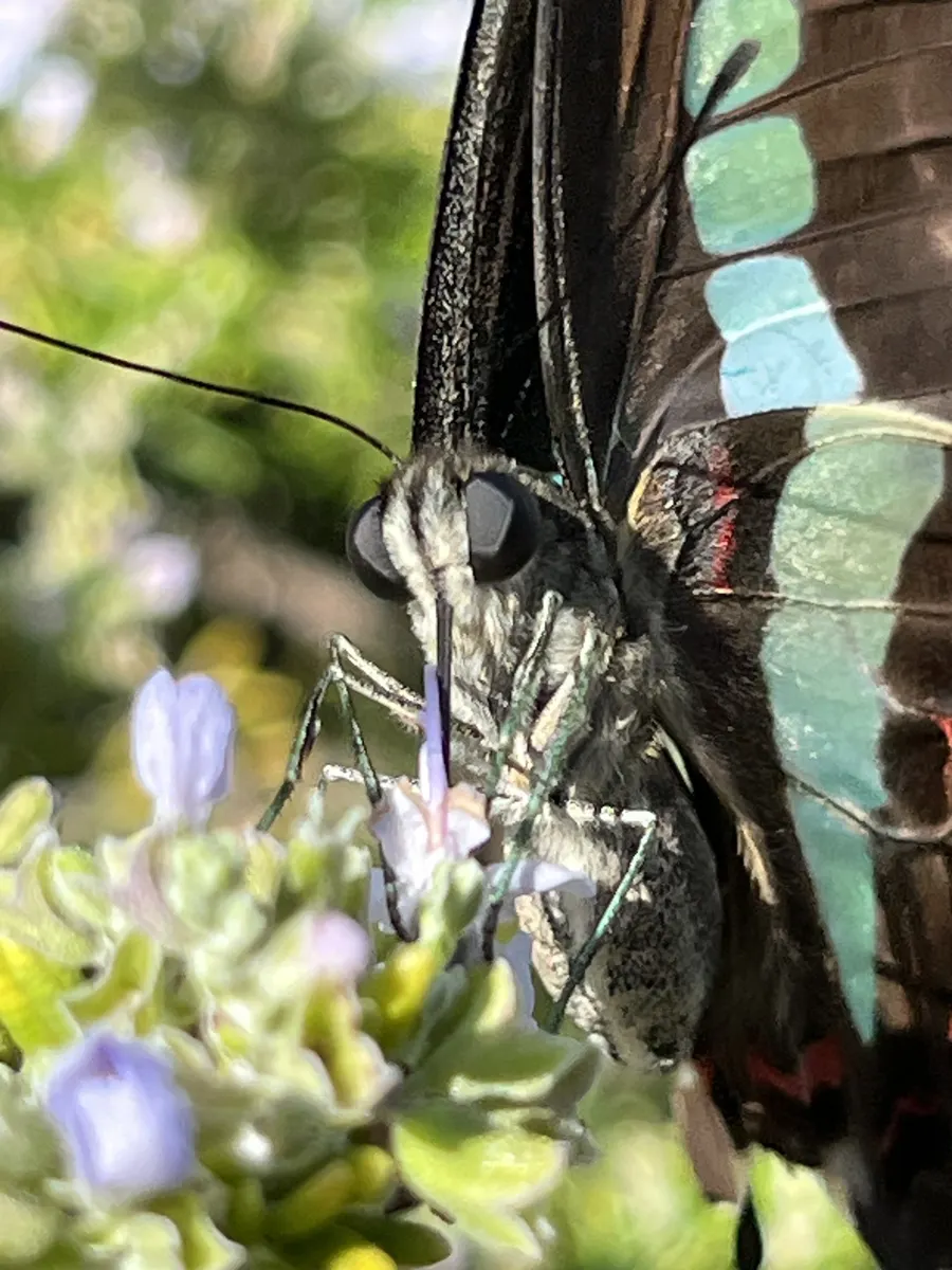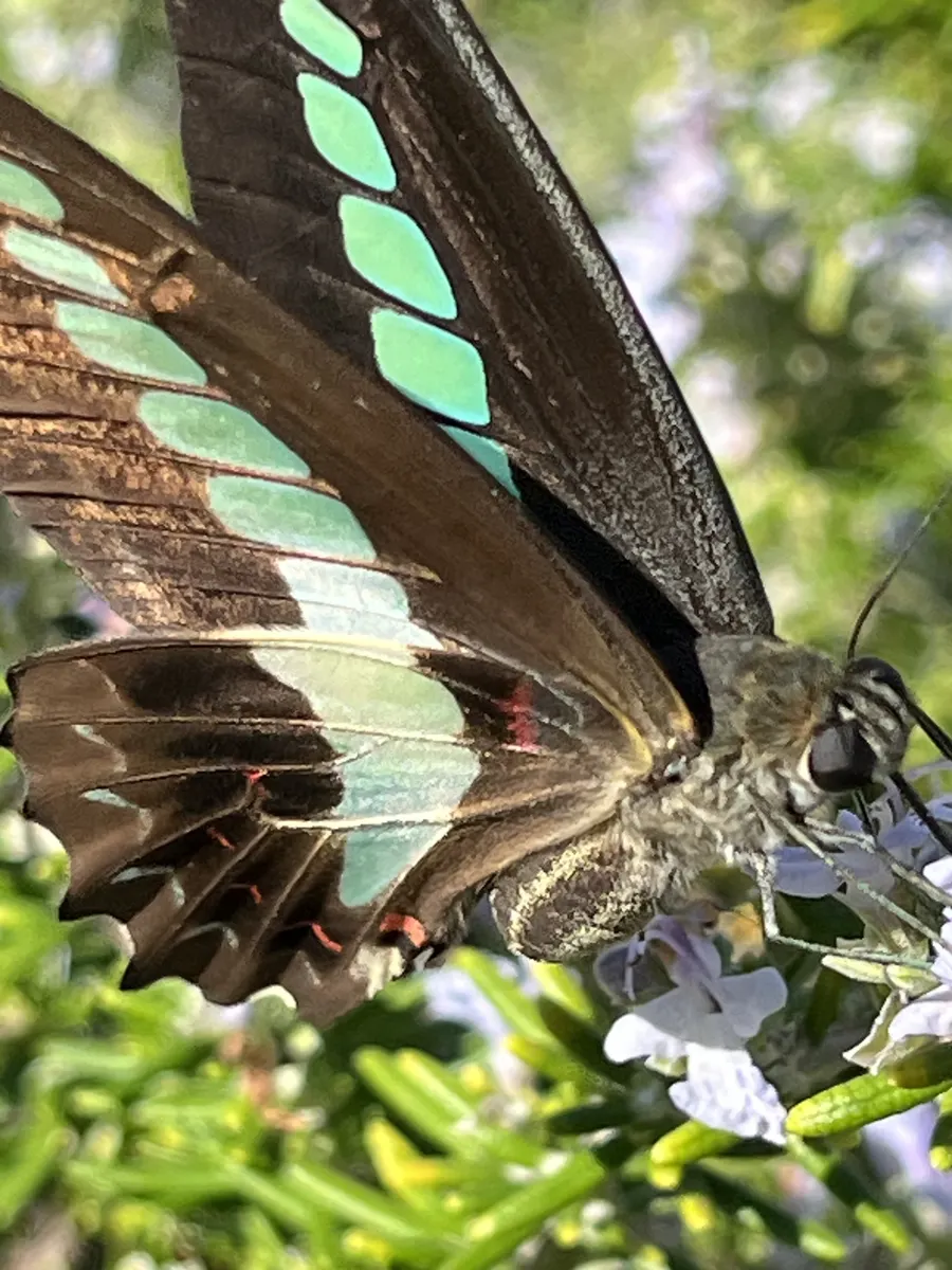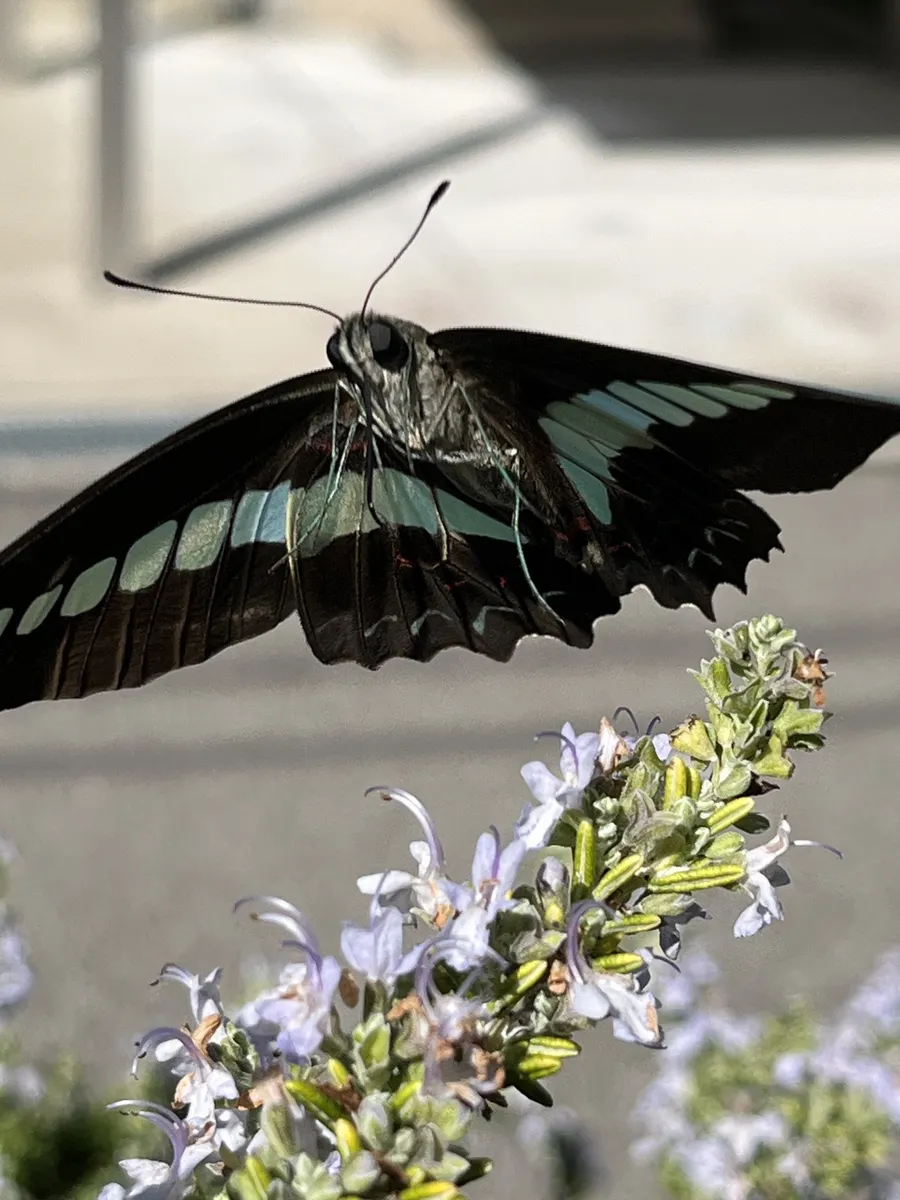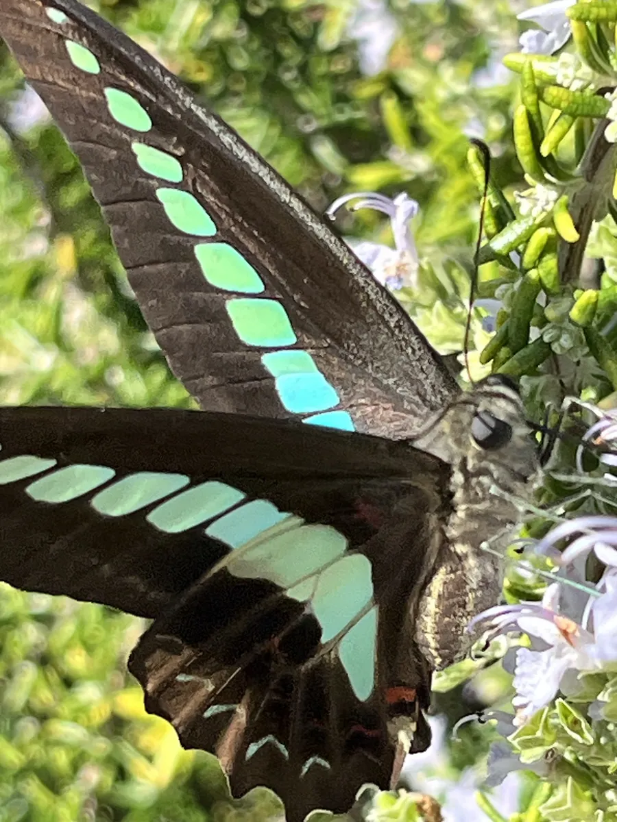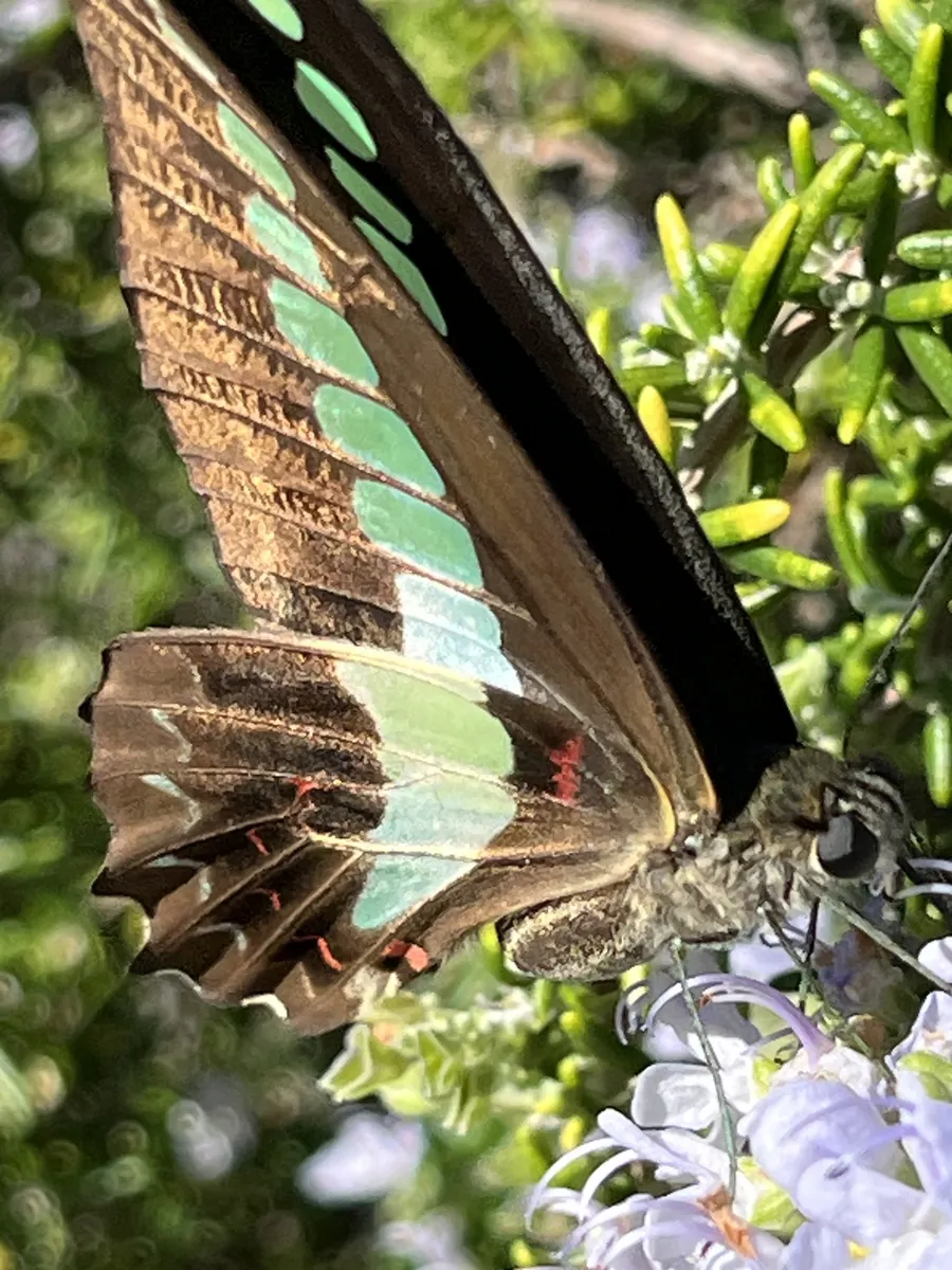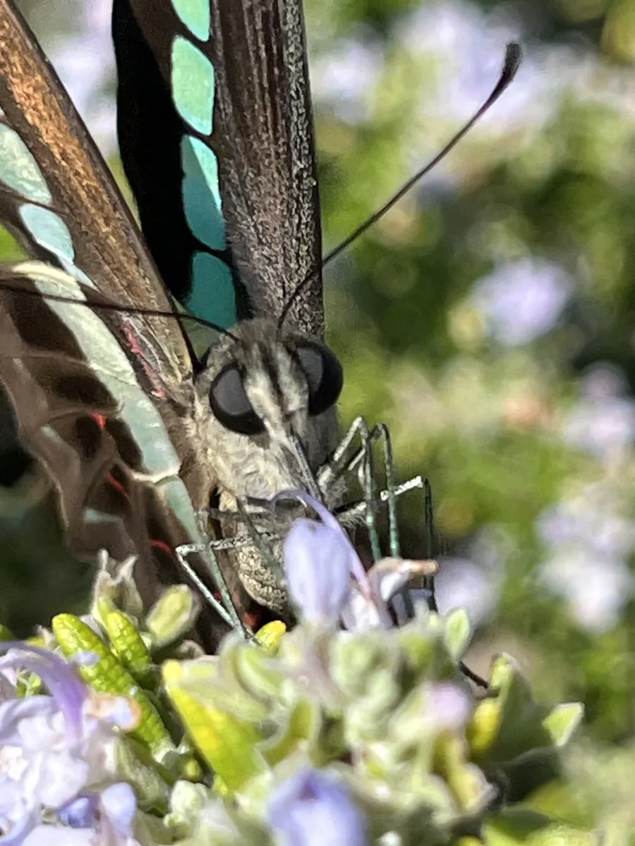 我が🏠にほったらかしでも巨大化したローズマリーが今年もたくさんの ちっちゃな花を咲かせました♬ ふと見ると一匹のアオスジアゲハが蜜? (ちっちゃな花に蜜があるかどうかは😆) を求めて飛び回ってたので 思わず写真撮りまくっちゃいました! その写真がこちら👇連続でどうぞ🫱